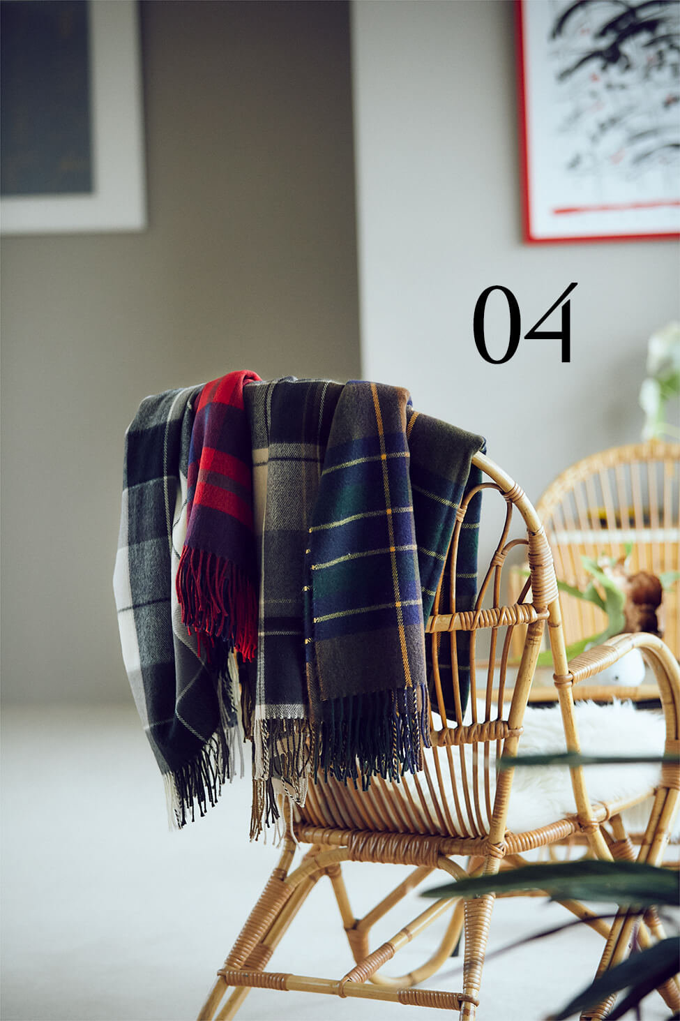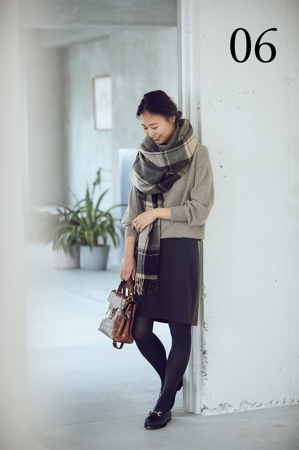 冬になるとチェックのストールをプラスするだけでコーディネートが楽しくなります。巻かなくてももう持っているだけでも良い(笑)。このストールはチェックの色にコントラストがなく、子供っぽくならないところが良い。肌触りも抜群です。