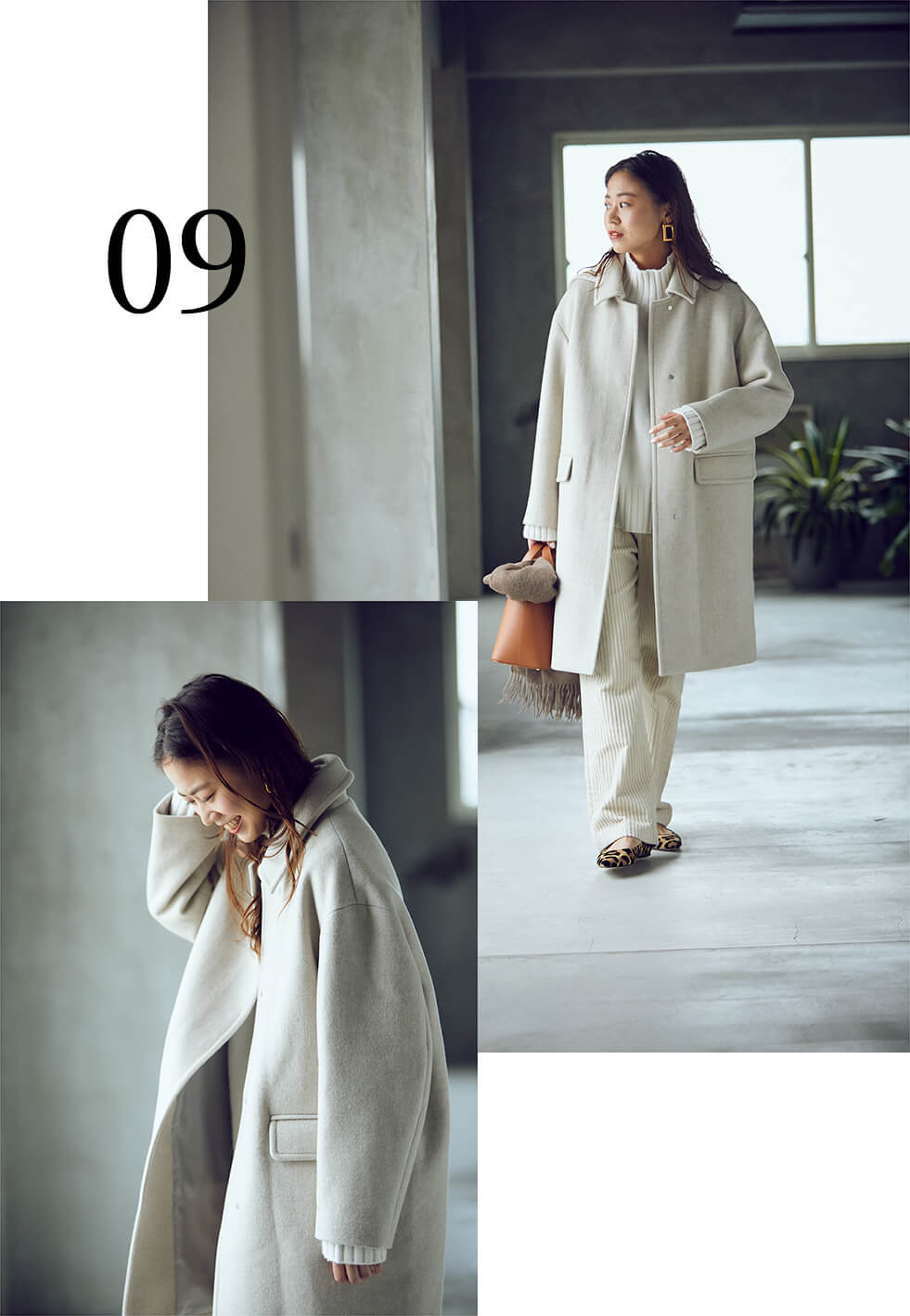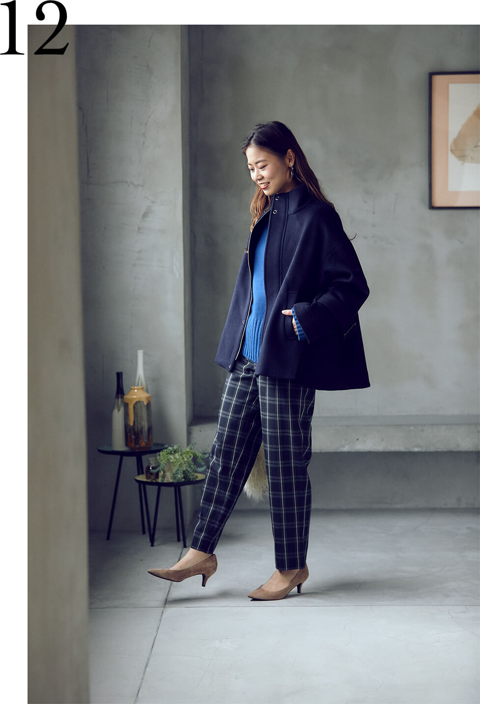 ”キレイなお姉さん”をイメージしたスタイリング。全体のカラートーンを統一して、コートのAラインが際立つようにテーパードのパンツを合わせました。とにかくこのコートは前から横から後ろからどこから見ても可愛いんです。