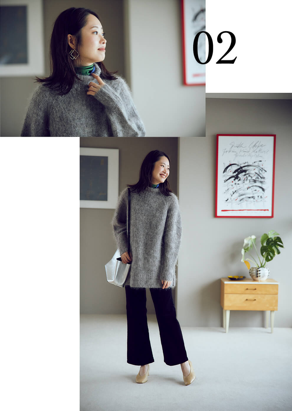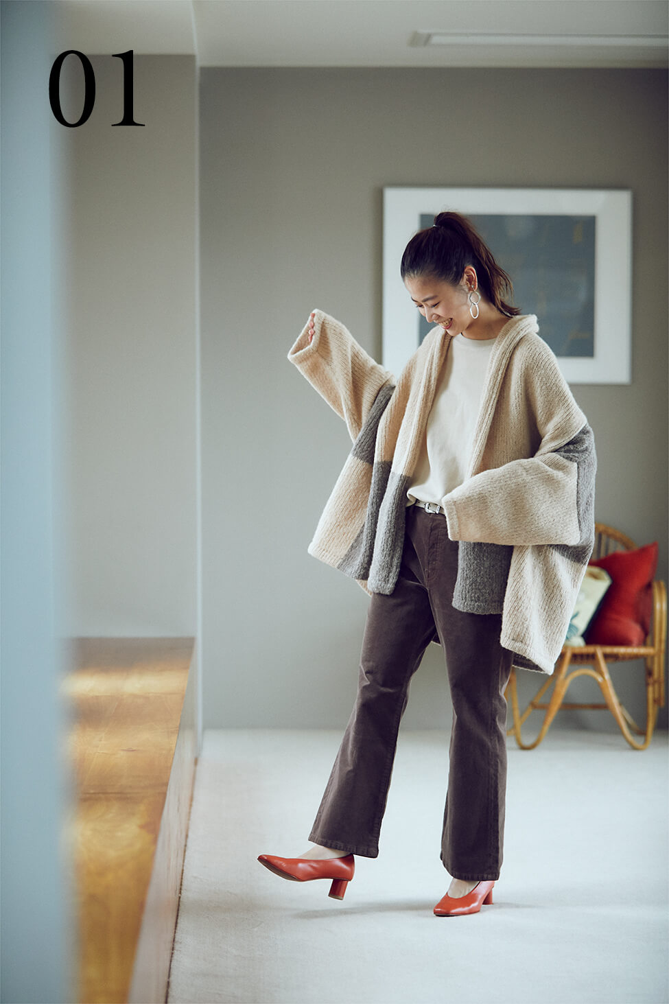 スウェットとコーデュロイパンツのカジュアルな組み合わせには、オーバーサイズの柔らかいニットを合わせると辛口さが半減されて優しい印象になります。シルバーのアクセをきかせて、大人のカジュアルスタイルをイメージしてみました。このパンツのシルエットならブーツを合わせても今年らしいですね。