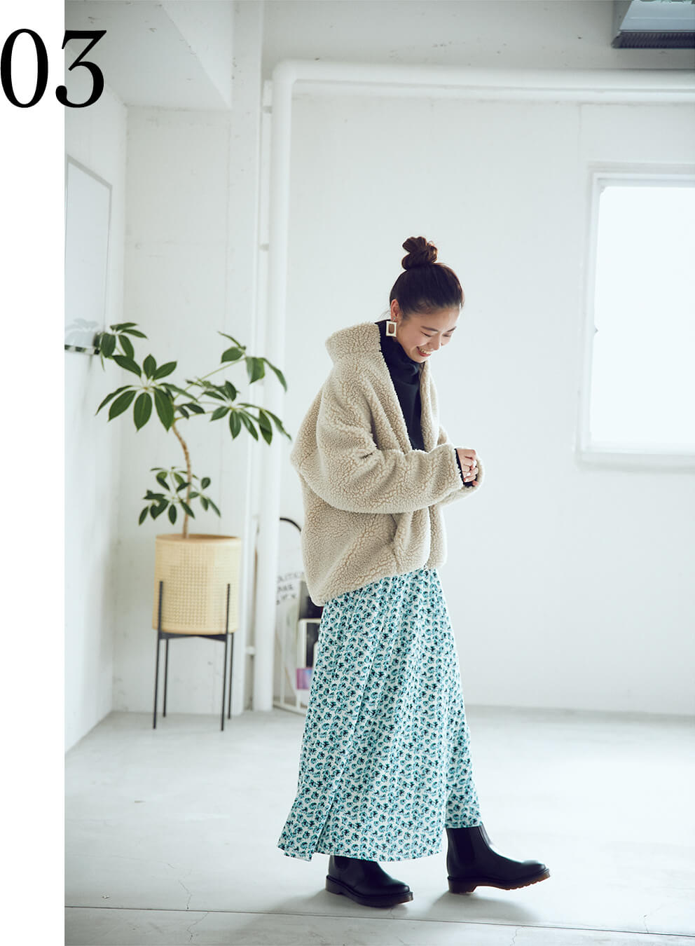 レディライクな花柄のロングスカートとスポーティなボアブルゾンのテイストミックスな組み合わせ。こういうブルゾンってパンツを合わせる人が多いと思うんですけど、実はスカートともすごく相性が良いんです。ブルゾンはちょっと襟を抜いて着ると今っぽさが足されます。