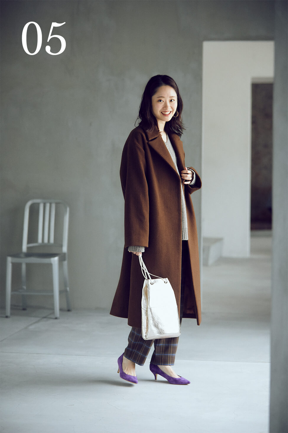 インにVネックのニットを合わせているんです。重たいコートの中から素肌がちらりと見えるとすごく素敵ですよね。肌見せ感が寒いですが大人の女性だなと。色をきかせるなら今年は絶対パープル。ブラウンとパープルはとても相性が良く、お互いの色を際立たせてくれます。