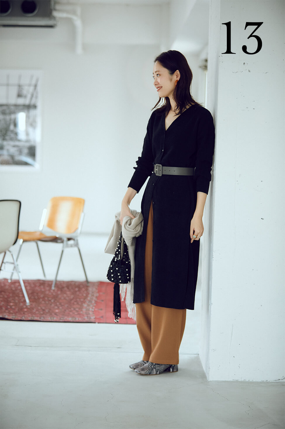バランスをとるのが難しい”長いトップス”×”長いボトム”の合わせは、カーディガンのリブ素材とウエストに巻いたベルトでメリハリのある女性らしいコーディネートに。パイソン柄のブーツを合わせてトレンド感をプラスしました。