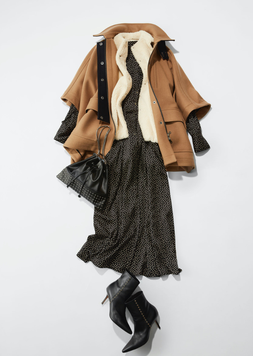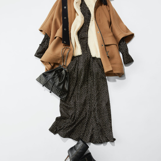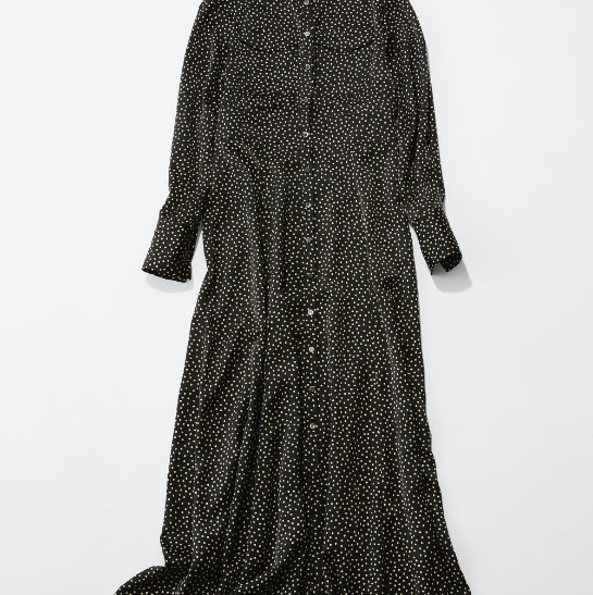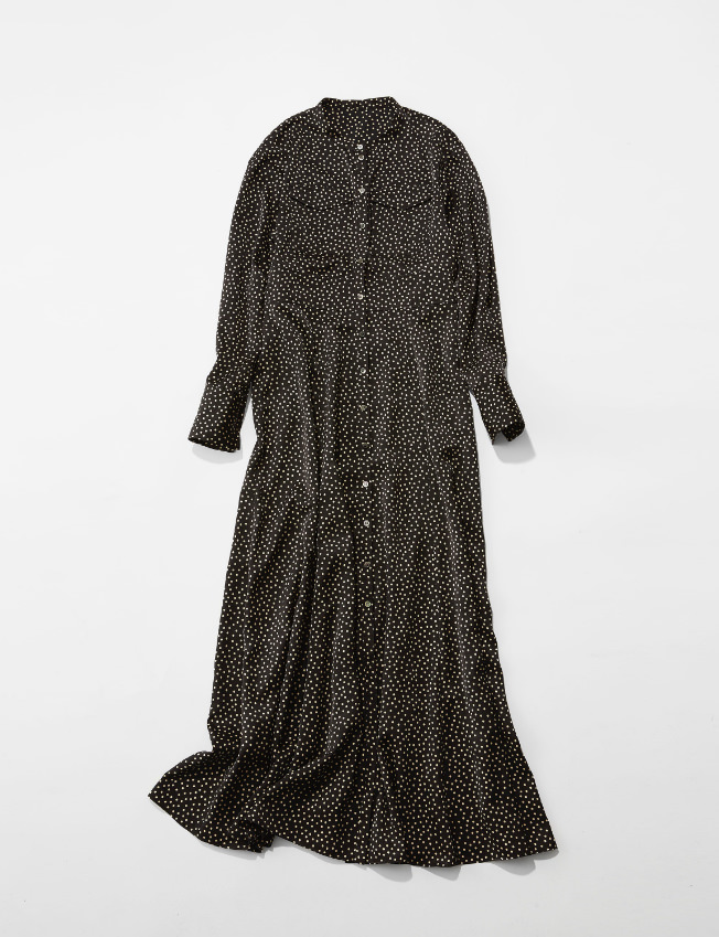 「N.Jamでは定番のドットプリント。今回はフルレングスのドレスに仕上げました。 メンズライクなハンティングコートと、ライナー代わりにファーベストを合わせてフェミニンなドレスをトラッドなムードにスタイリングしました。丈の短いアウターにはミディ丈のボトムよりフルレングスがバランスを取りやすいと思います。スタッズのバッグやポインテッドトゥのショートブーツなどシャープな小物を合わせて欲しいです。」