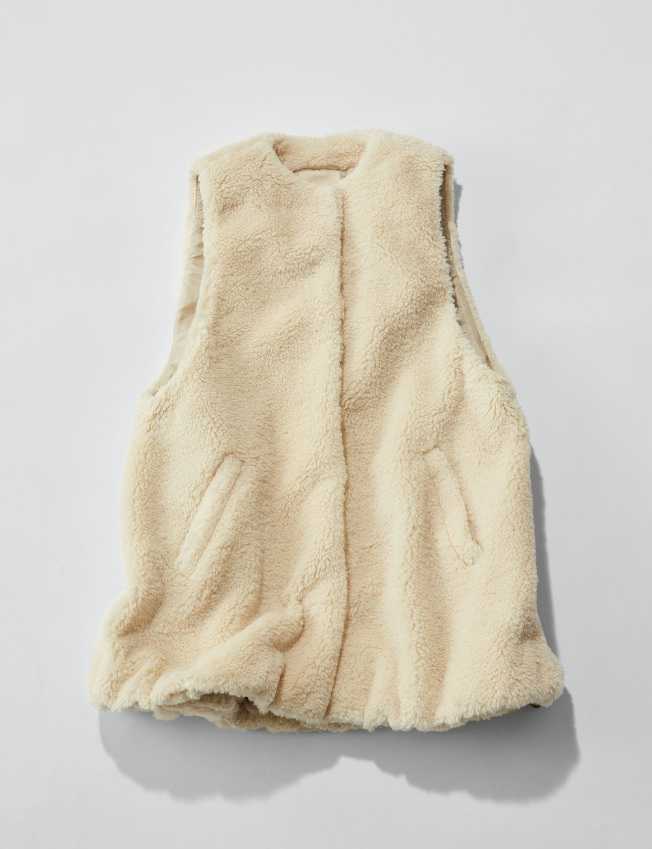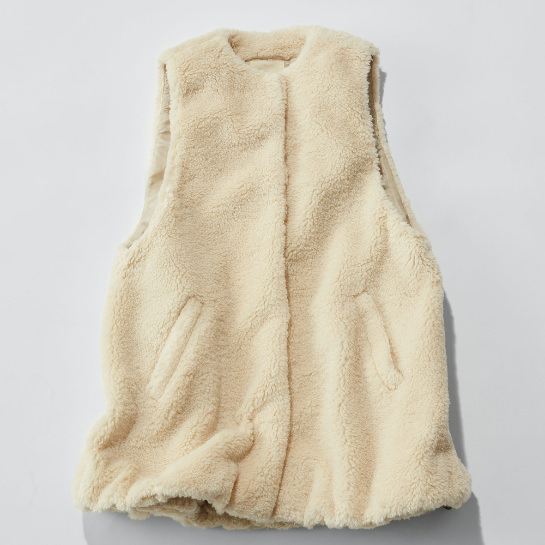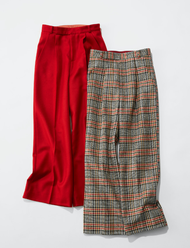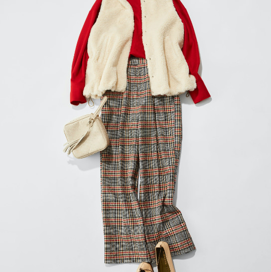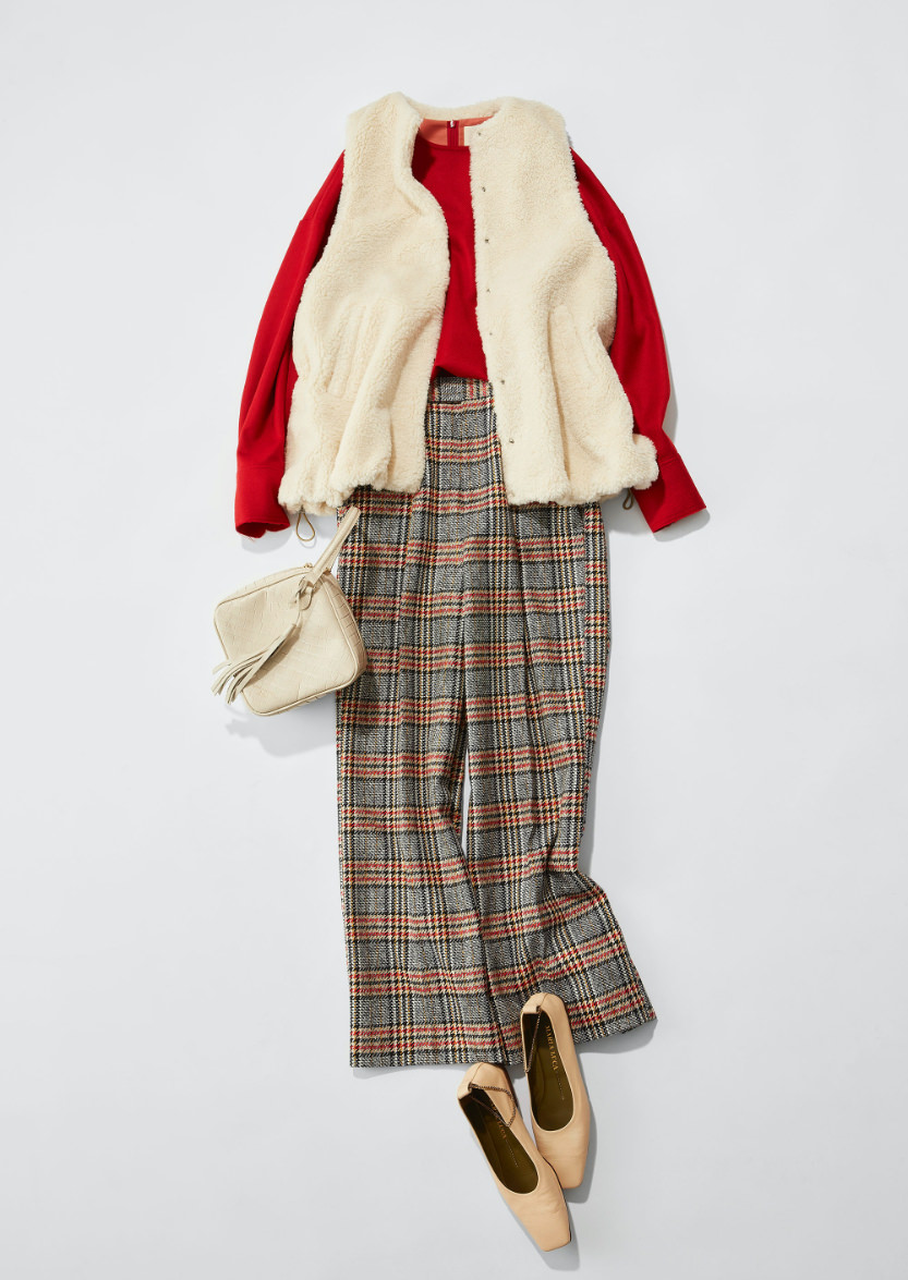「赤がポイントになったグレンチェックパンツには赤いブラウスを合わせたい。一見派手な物同士の合わせですが、パンツから色を取って合わせているので全体がまとまります。そこに今年合わせたいと思っているのがテディベアーのような風合いのフェイクファーベスト。辛口のスタイリングが一気に和らぎます。大人の女性にこそサラッとカジュアルに取り入れて欲しいです。」