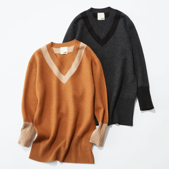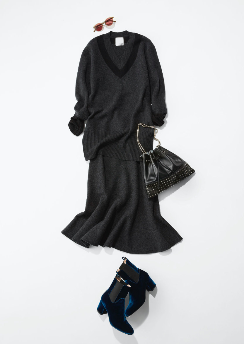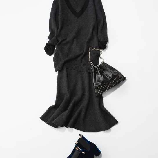 「チルデン風のトップスは着丈が長く身体が少し泳ぐくらいのサイジング。一方スカート身体にフィットしながらカーブを描くマーメイドライン。それだけでかなり女っぽいアイテムなので、スタッズのバッグやカラーサングラスなどクセのあるアイテムで遊びを加えて着こなして欲しいですね。グレーは個人的にもこの秋冬の注目カラー。ブラックやネイビーなど同系色で辛口に着こなしたいです。」