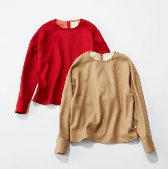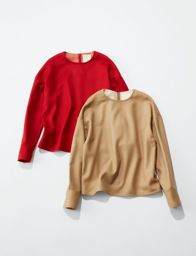 丸首と切りっぱなしのカフスが特徴的。パーティーシーンにもセットアップで着て行って欲しい同素材のパンツもあり。