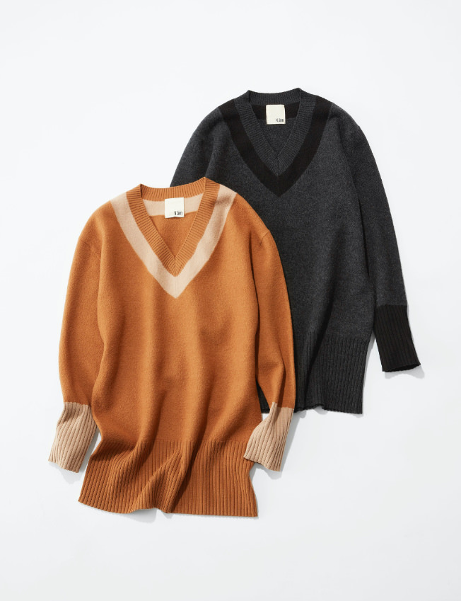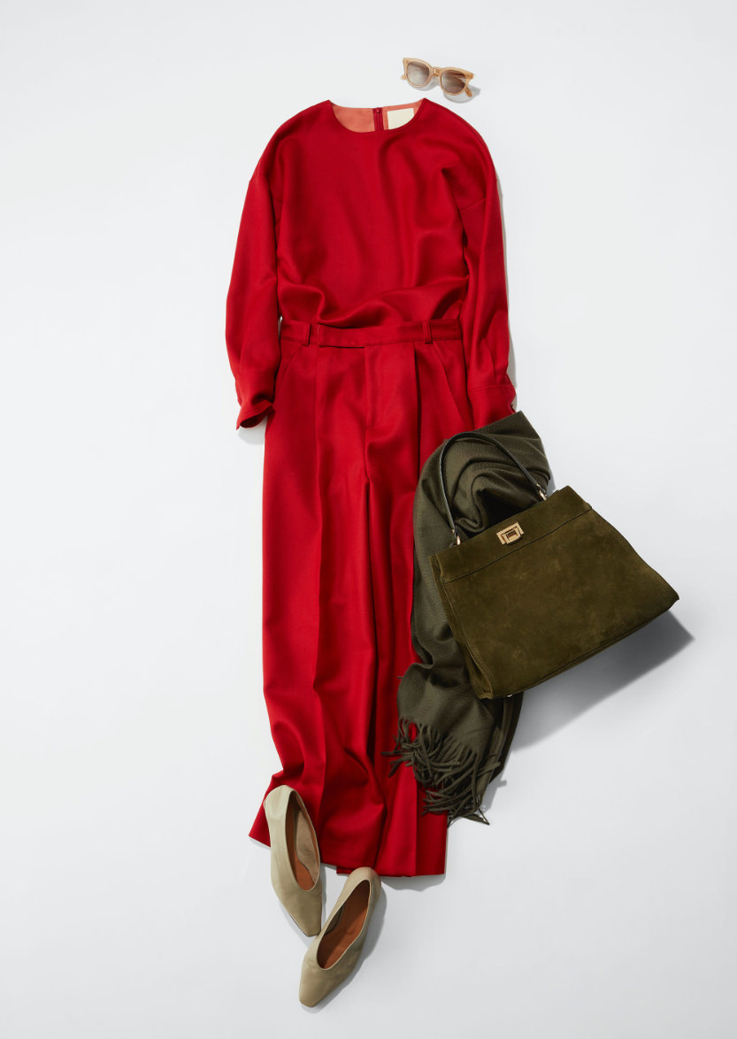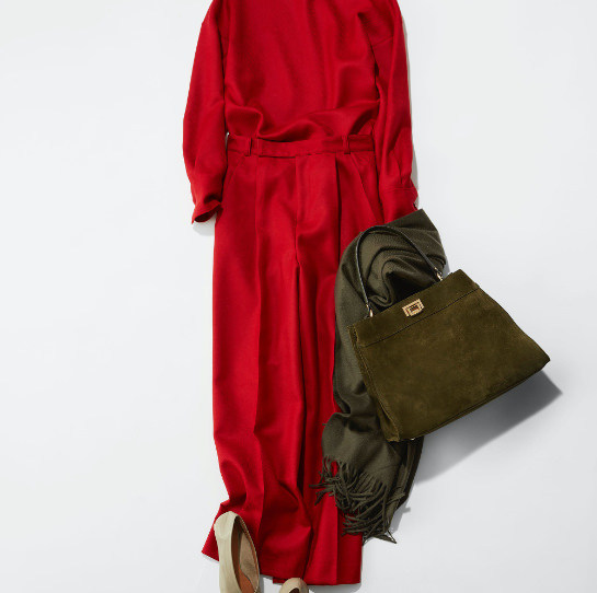 「“赤”は私の好きな色であり、N.Jamにも欠かせない色。潔くセットアップで合わせ、ポイントにカーキ&ベージュの色を差しました。リッチでコンサバティブなムードで着こなすのも新鮮な感じで今の気分にぴったりです。ハイヒールを合わせるとマダムっぽっくなってしまうので、足元はフラットシューズやスニーカーを合わせたい。逆にハイヒールを合わせる場合は、ポシェットなどカジュアルなバッグがおススメです。」