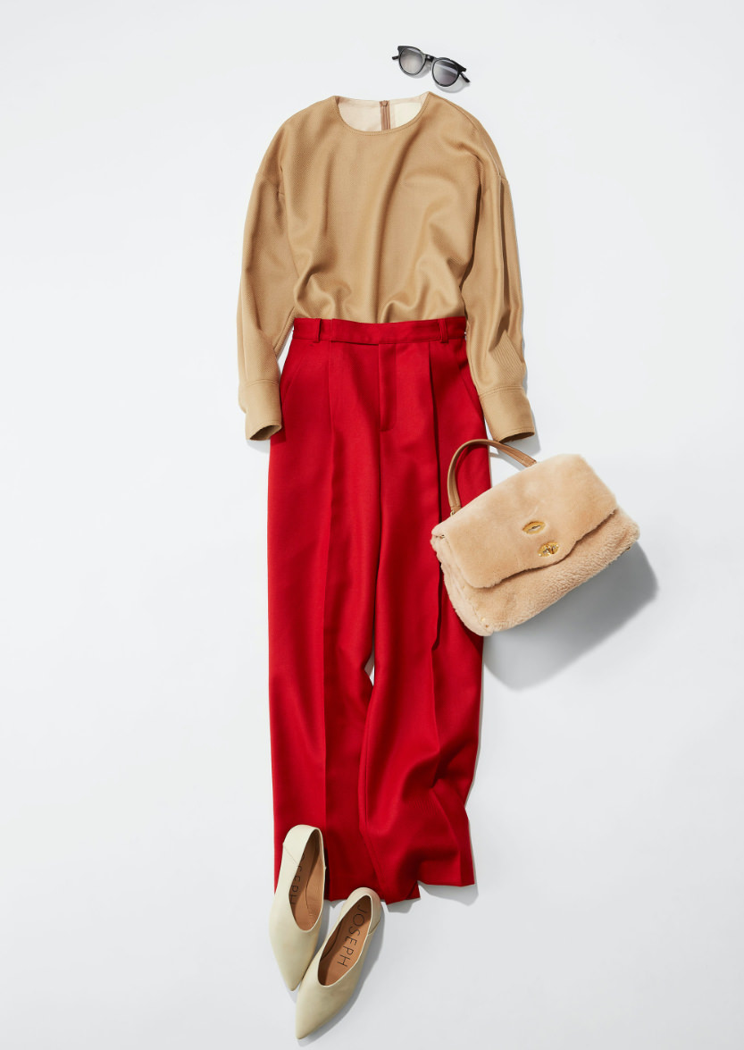 「赤とベージュの色合わせは上品でありながらも、どこか強さもあって最高に相性のいい色合わせだと思ってます。同じアイテムでも先ほどの上下赤のスタイリングより柔らかな印象ですよね。縫いぐるみの様なボアのバッグと白いフラットシューズでより全体に暖かみを加えて。ベージュのキャップとかあれば合わせても素敵だと思います。」