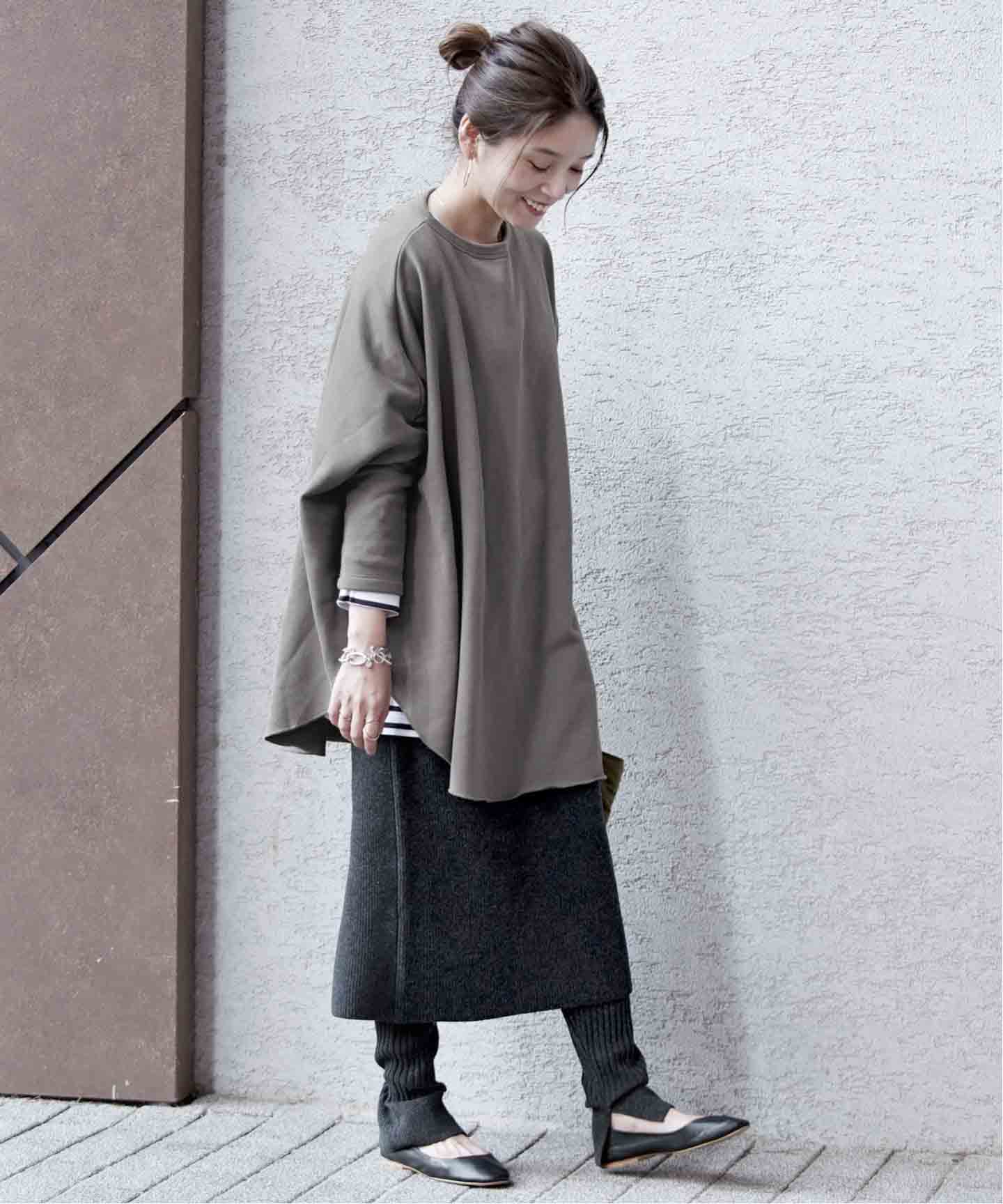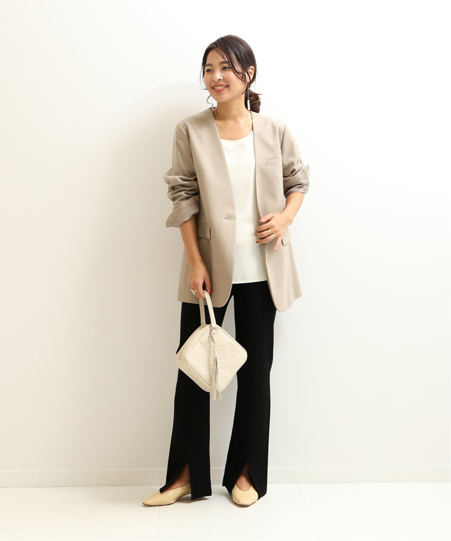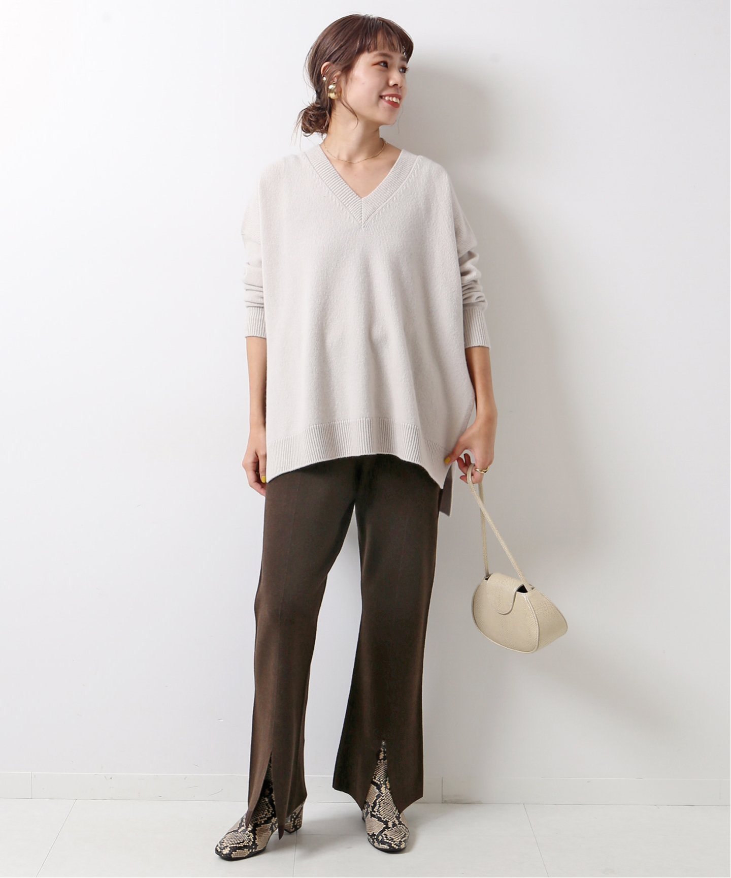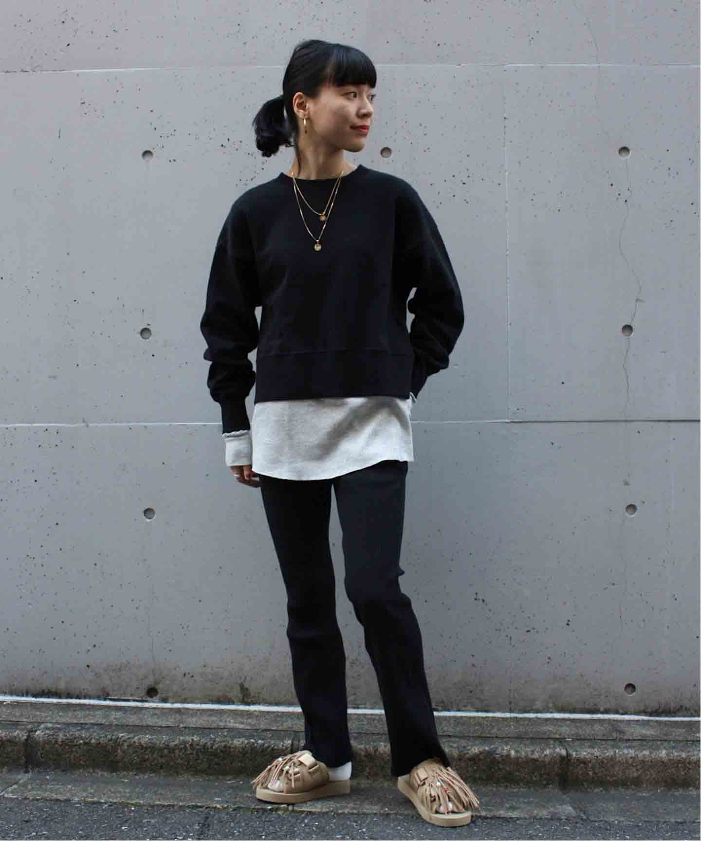 重ためコーデに抜け感を目を引くセンタースリット入りのリブパンツは
