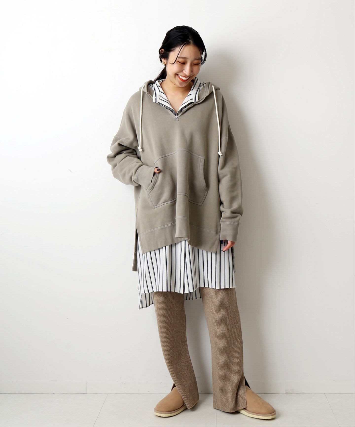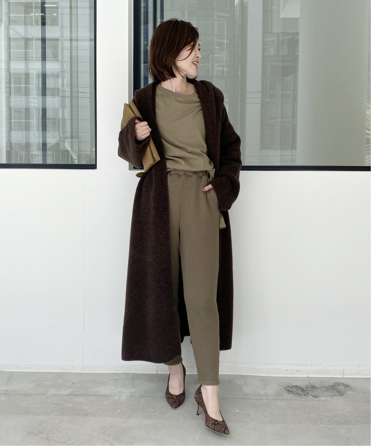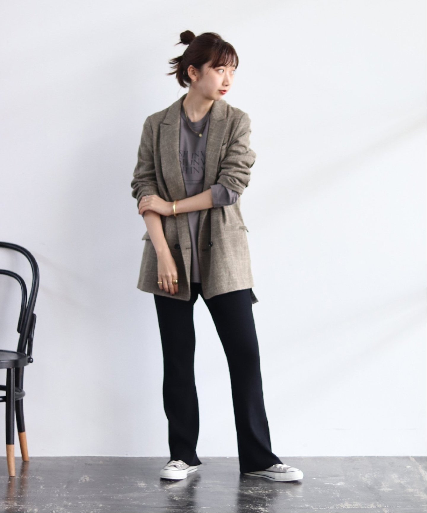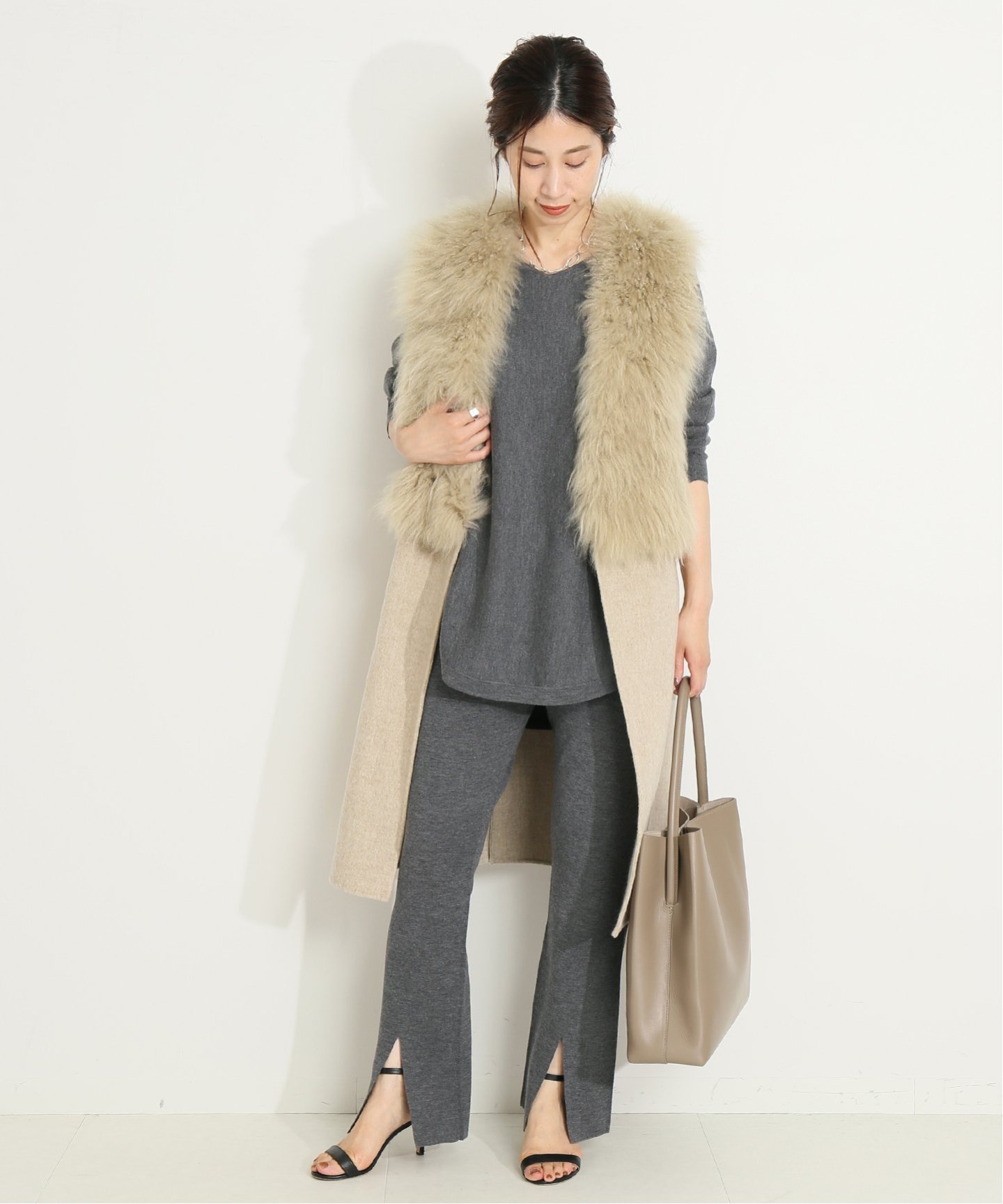 重ためコーデに抜け感を目を引くセンタースリット入りのリブパンツは