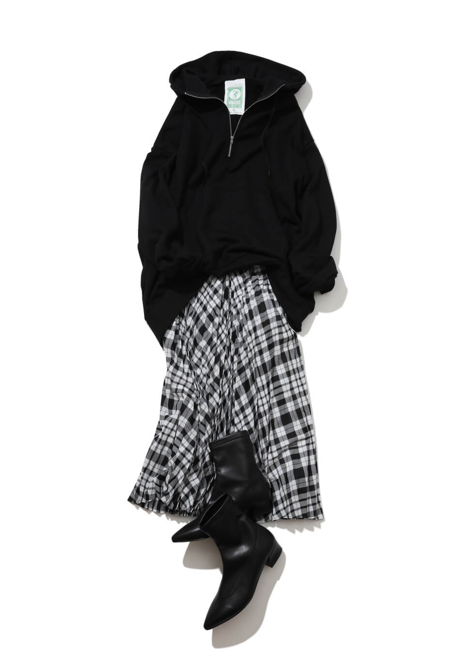 暑さが落ち着いて季節の移り変わりを感じさせる日には、とっておきの秋アイテムをおろしたい。これからヘビロテ間違いなしのオーバーサイズのフーディーに、チェックのプリーツスカートをオン。どちらもモノトーンで統一感を持たせて、スポーティモードなニュアンスを漂わせて。足元はブラックのショートブーツで引き締めを。