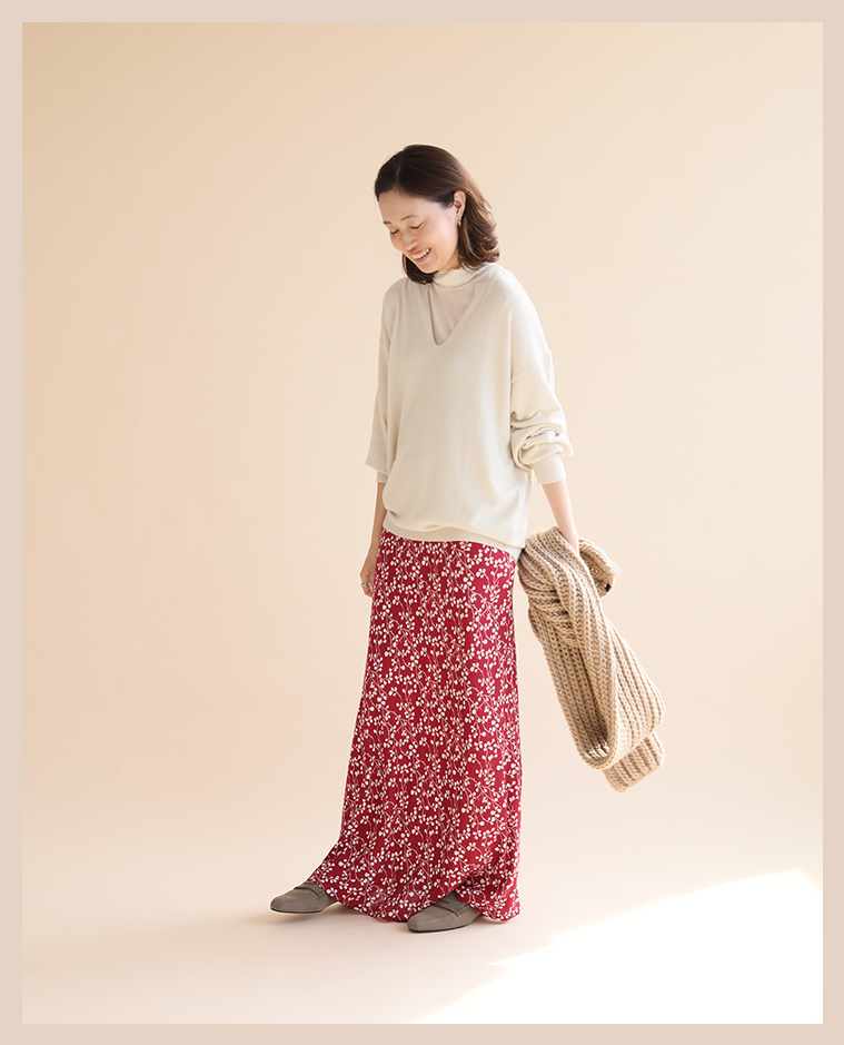 フェミニンなアンゴラのニットを手元のレッドで締める。