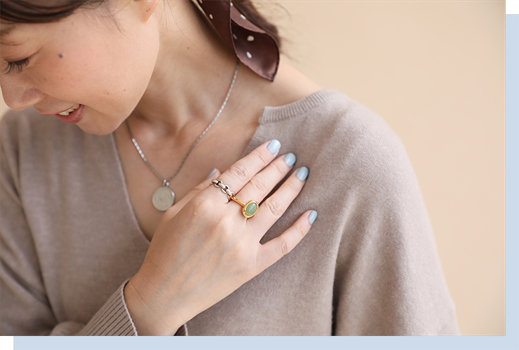 アクセサリーを重ねる感覚で大人カジュアルにアクセントを。