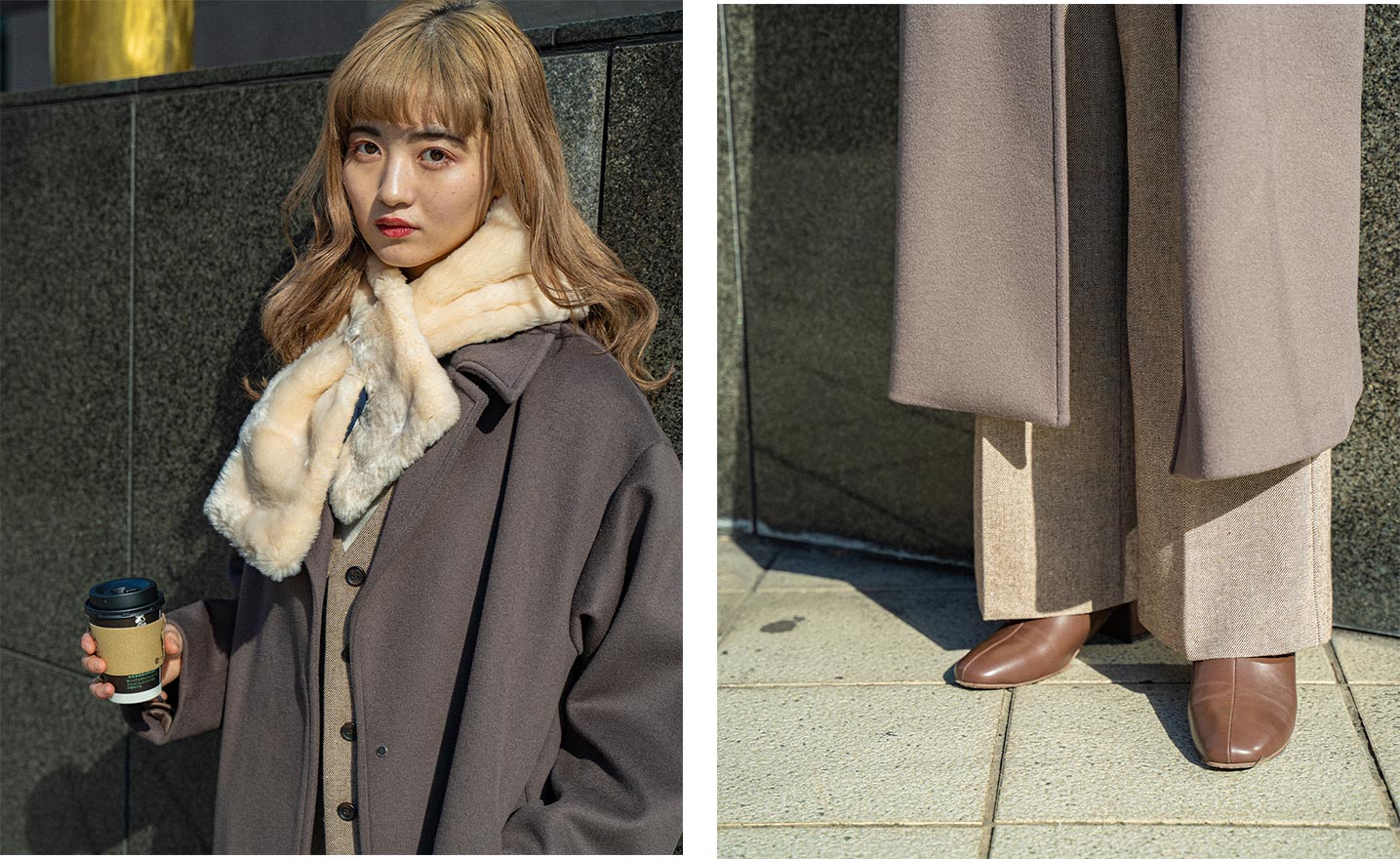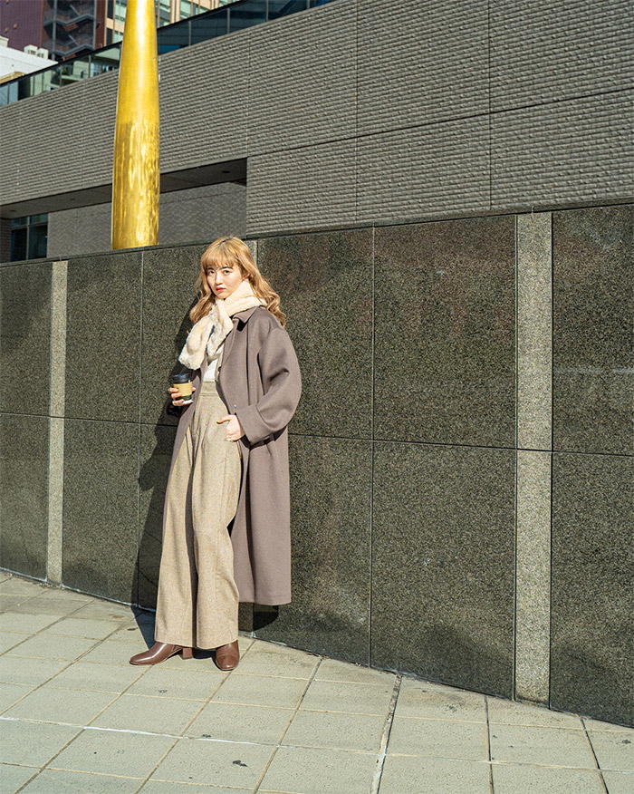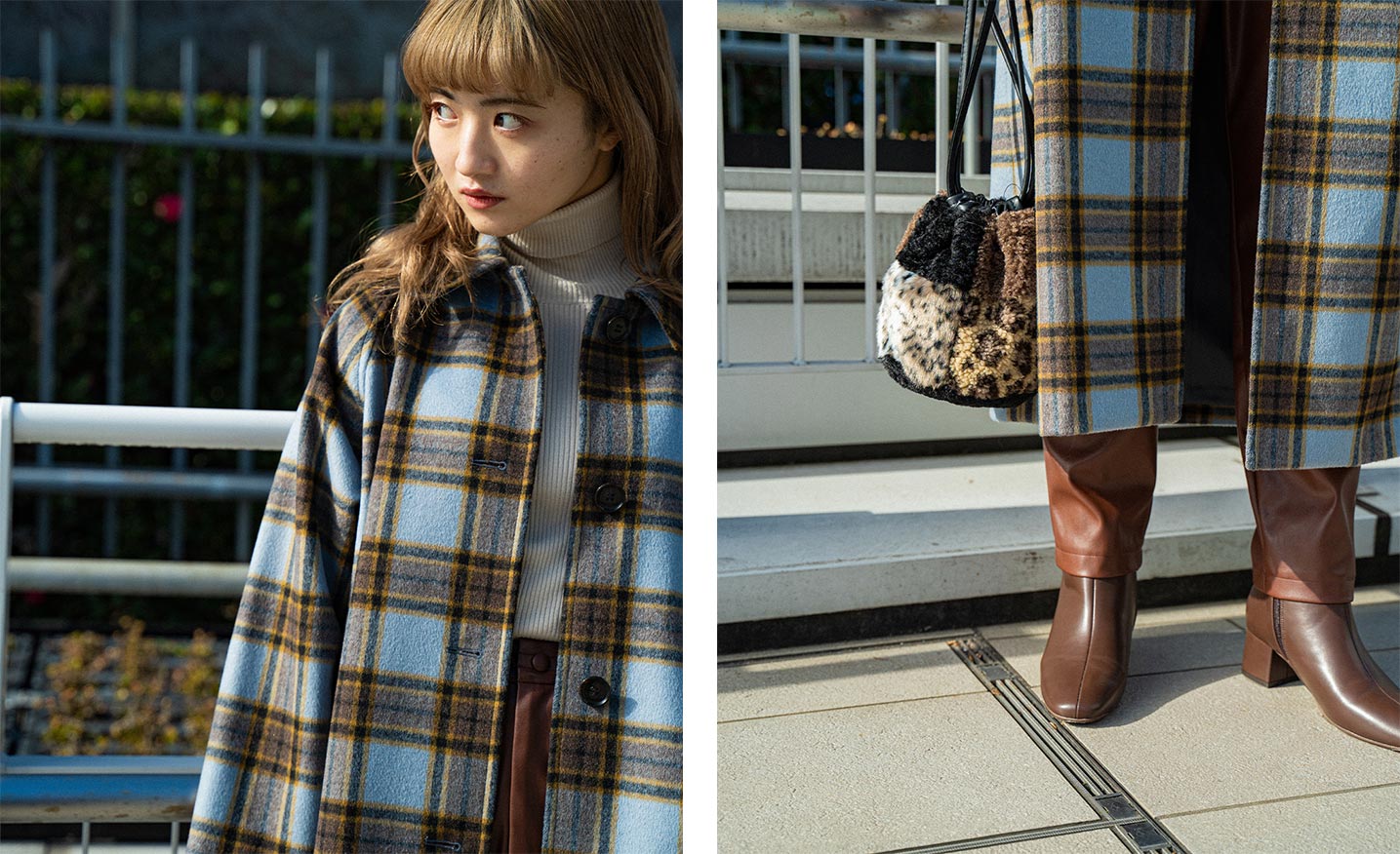- 主役となるチェックのコートは少しロング丈で。 チェックの色に合わせて茶系でスタイリングすることでまとまりがアップ。