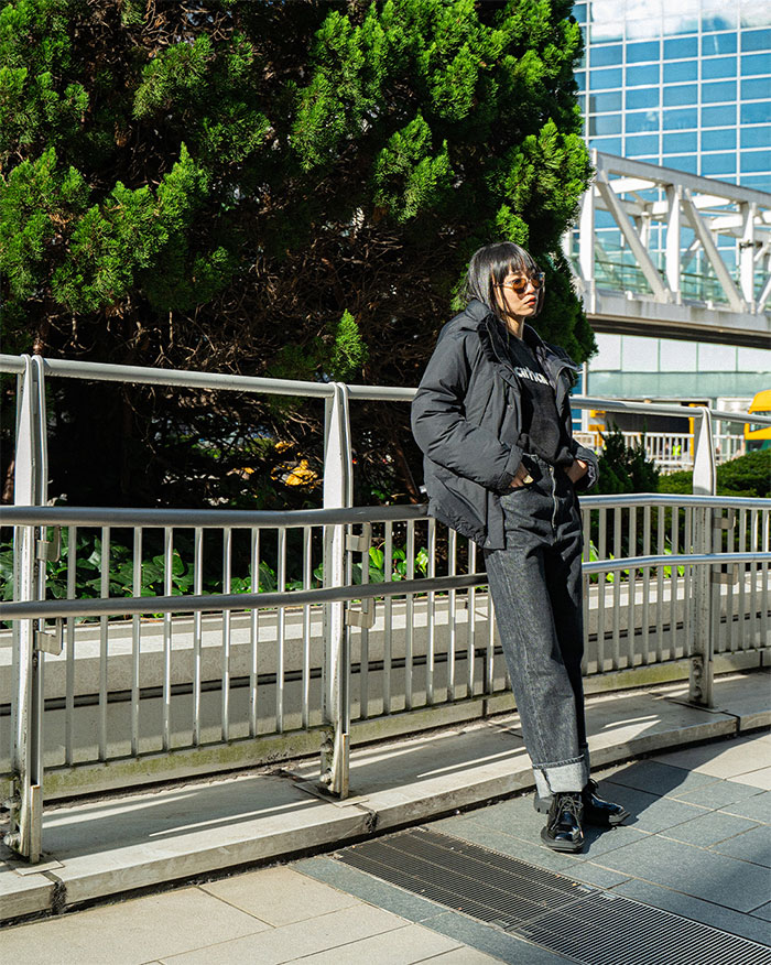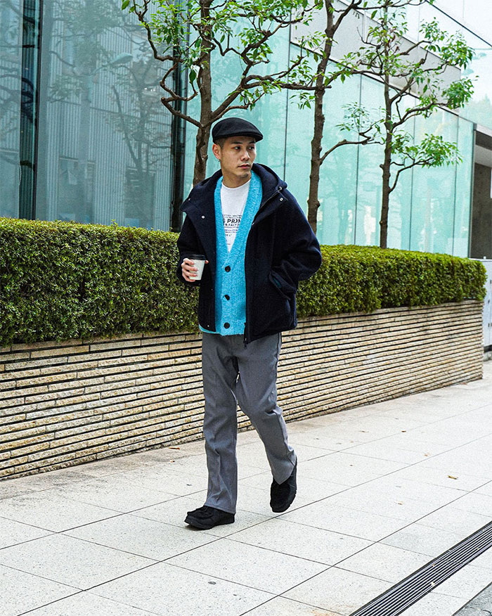 - すっきりとした短丈のブルゾンは重くなりがちな冬のスタイリングを軽くしてくれます。 同系色でまとめトップスに明るい水色を差すことで華やかに。