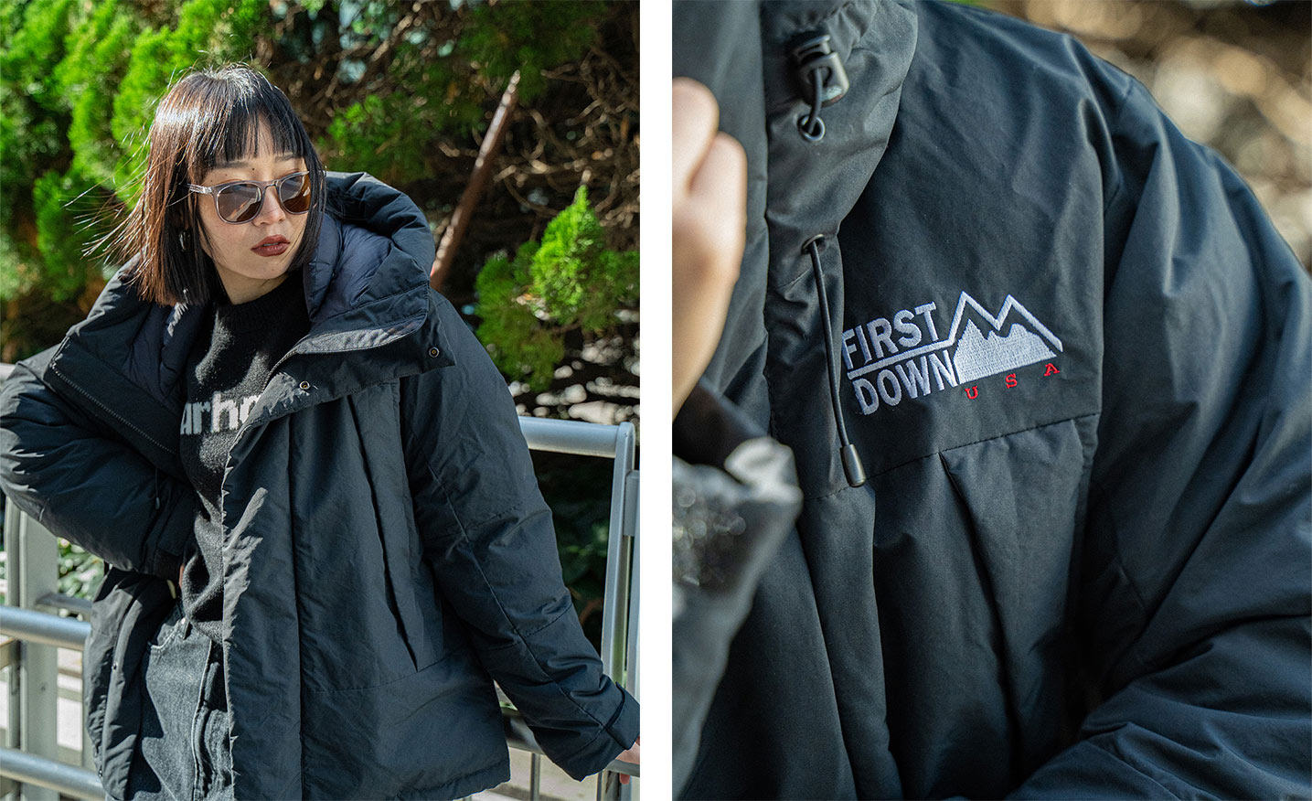 - 冬のワントーンコーデはFIRST DOWNのダウンジャケットで。 大きめのフードが可愛らしく機能的で冬に1着は欲しいアイテム。 全身を異素材で合わせることでカジュアルさがありつつも、少しクールな印象に。