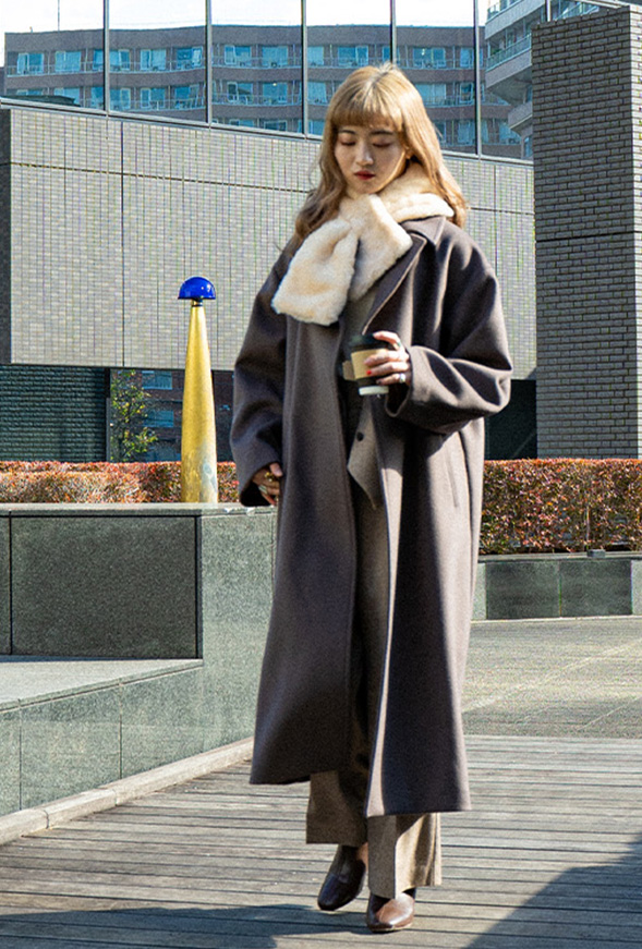 - トレンドの大きい衿がポイントになっているこのコートは、Iラインのシルエットのためスッキリ着ることができます。 ボタンが見えないデザインのためすっきりとした印象に。