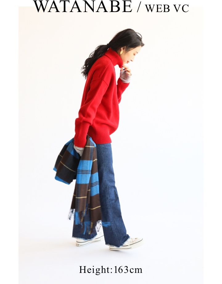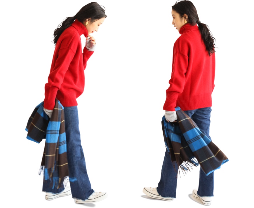 真っ赤なタートルネックの主役ニットに、鉄板の濃紺デニムをMIX。