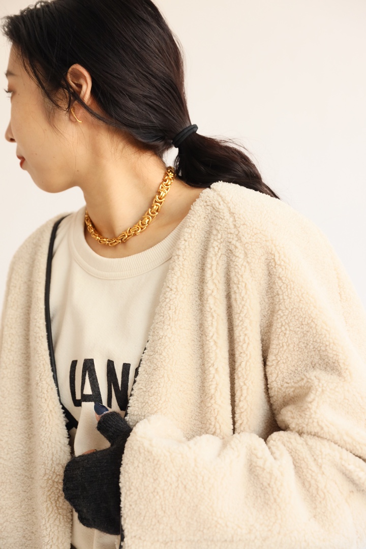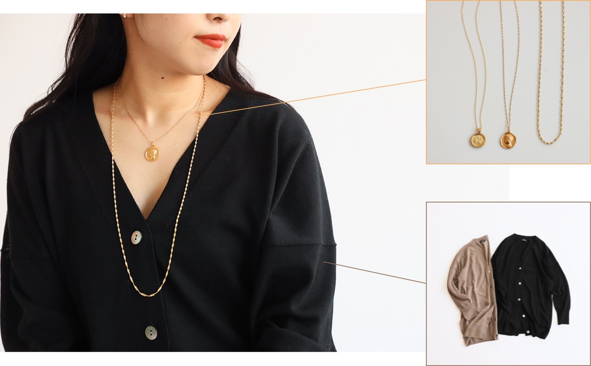 カーディガンの単品コーデの時こそ、ゴールドネックレスを重ね付けしてお洒落指数をアップ。