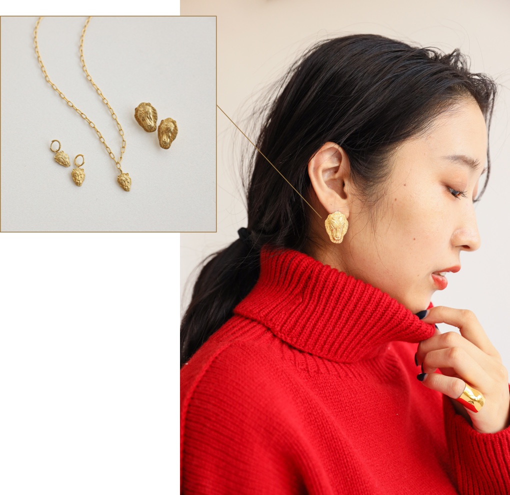 スタイリッシュな赤ニットをさらに格上げしてくれる、遊び心のあるライオンモチーフのピアス。
