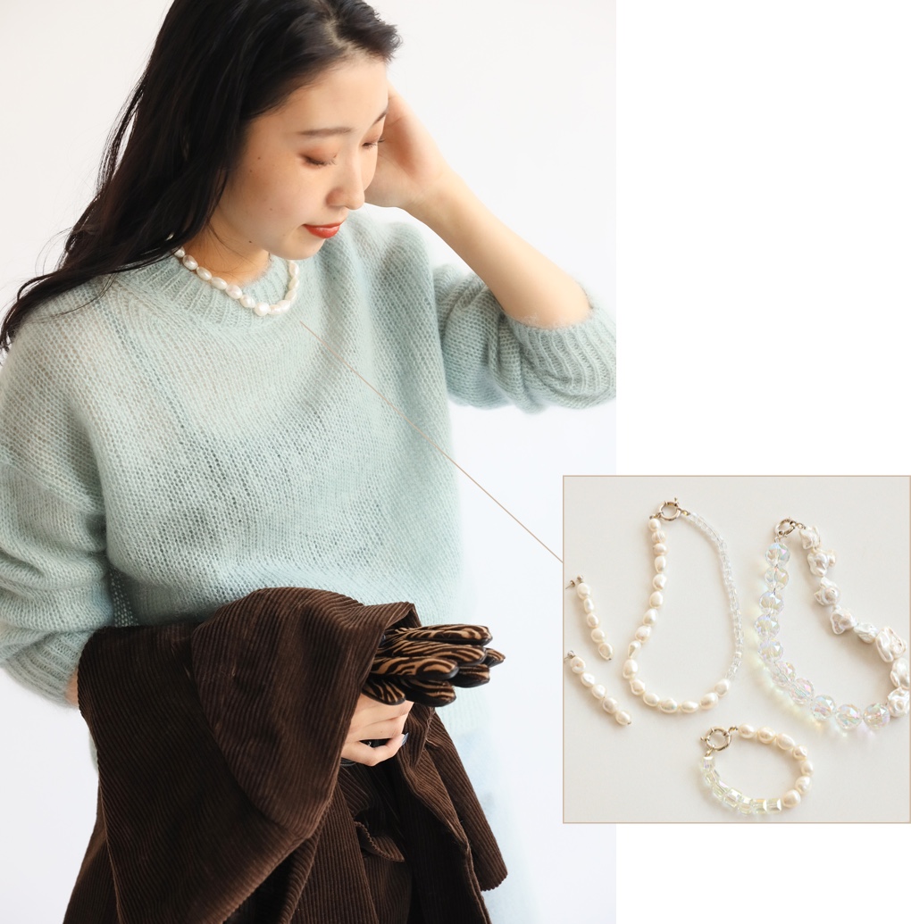 ニットのスタイルをレディに格上げしてくれる、パールアクセサリー。