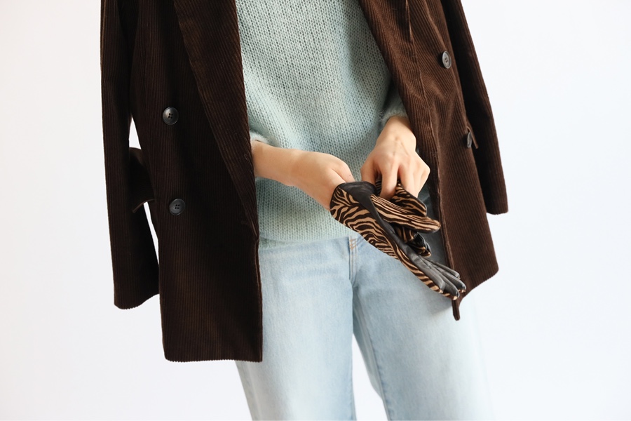 アニマルモチーフがトレンドの今季。中でも辛めなゼブラ柄は小物で取り入れるくらいがちょうどいい。<ALPO>のZEBRA GLOVEをハンサムコーデのアクセントに。