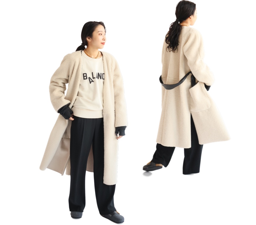 カレッジ調なロゴスウェット×ボアコートといったカジュアルスタイリングには、