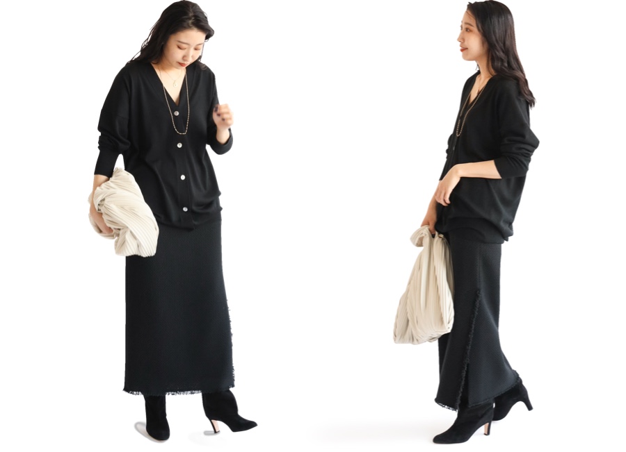 深めに開いたVネックがデコルテをきれいに見せてくれるカーディガン&抜け感のあるスリット入りスカートで女性らしい印象に。ゴールドアクセがさらに華やかさを演出。- JOURNAL STANDARD L'ESSAGE《追加》CASH FEEL WOOL Vネックカーディガン◆2¥16,500(税込)