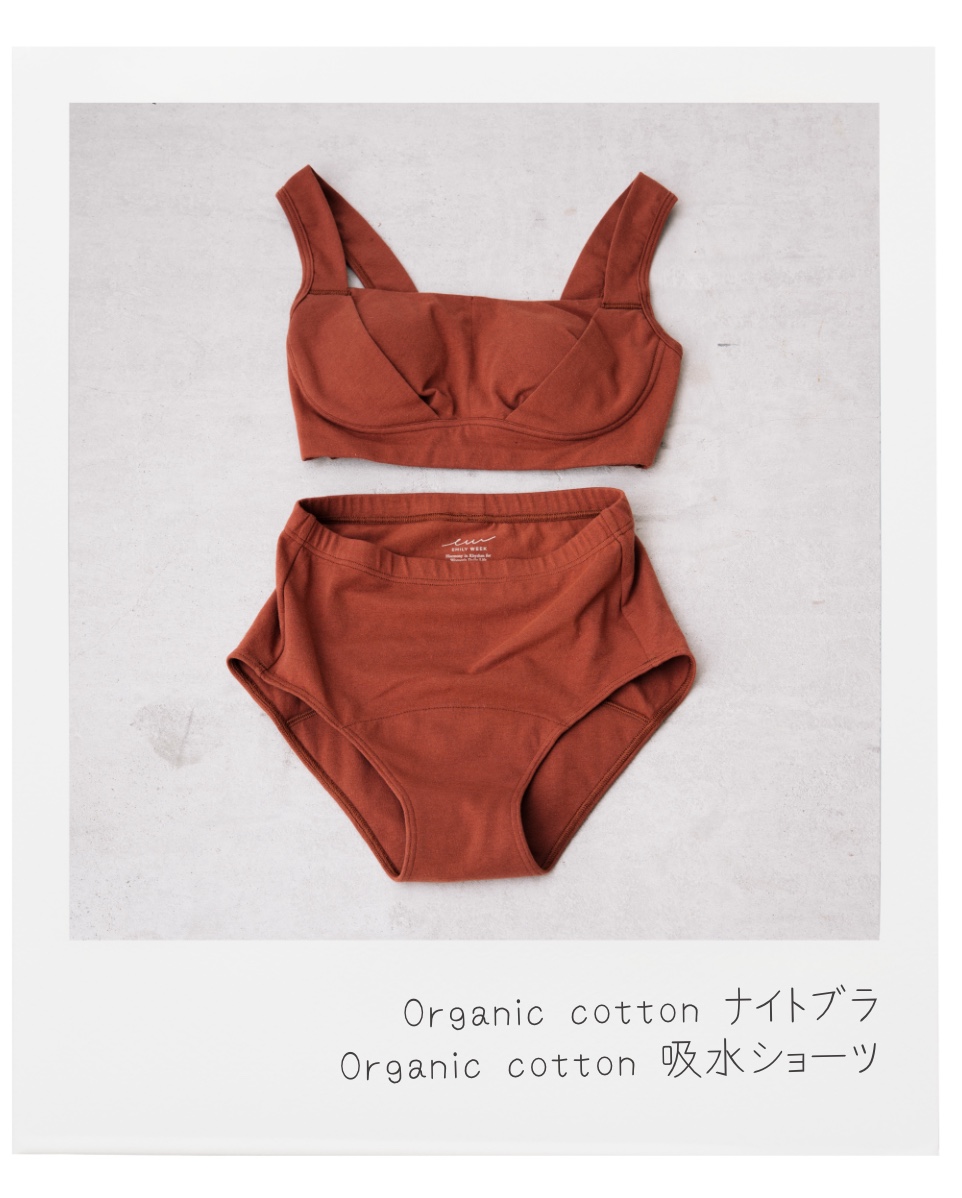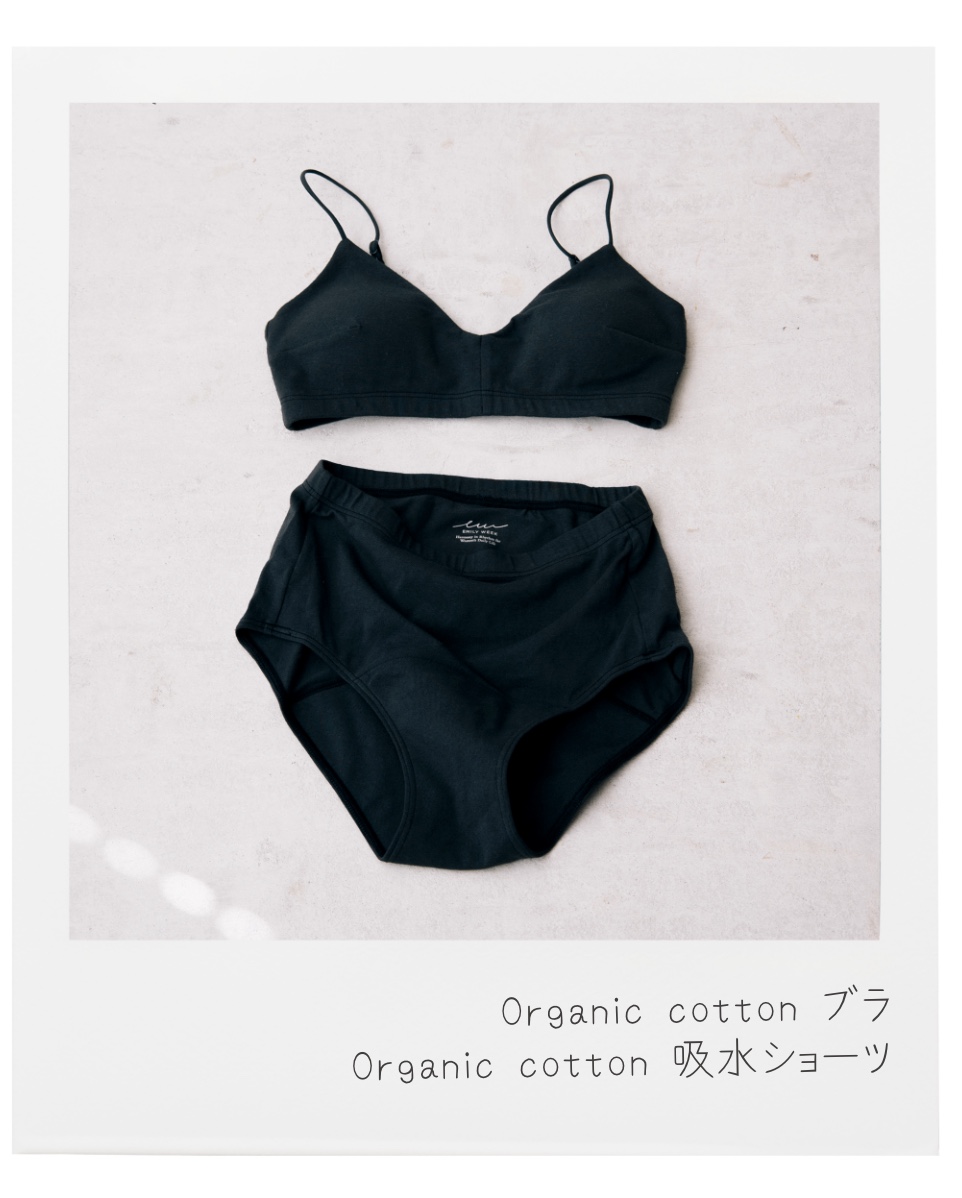 また、「organic cotton for RESET」のアンダーウエアもお揃いでご一緒に。ブラトップは締め付けが少なく、リラックス感がありながら身体がキレイに見えるVカットラインが特徴。華奢なストラップはチラ見せしても可愛いです。快適な着け心地とオシャレの両方が叶うのがポイント。