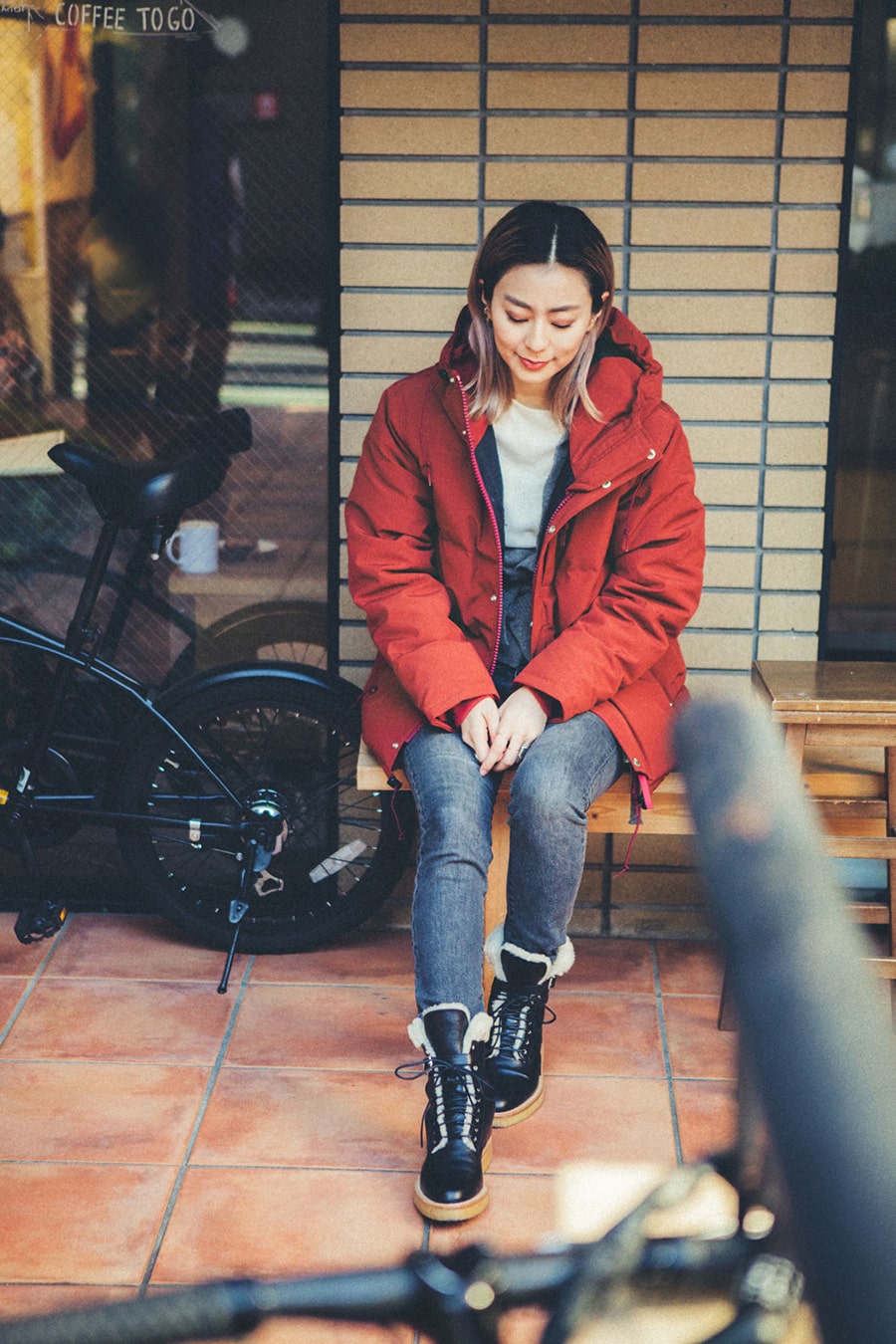 このデザインとカラーリングだったら、さらっとデニムにパーカを合わせたりしても可愛いだろうし、逆に女性的なスタイリングにも合うんじゃないかなと思って今日はこのコーディネートにしました。ダウンってストリート色が強くなるものが多いと思いますが、これは過度にロゴとかも入ってなくシンプルなので、色々な着方ができるのが良いですよね。撮影でずっと外にいることも多いので、軽くて動きやすいのに寒さを防げるのはすごく嬉しいです。