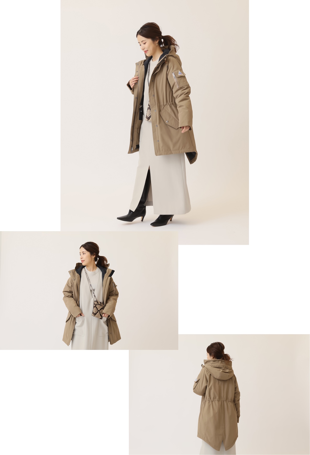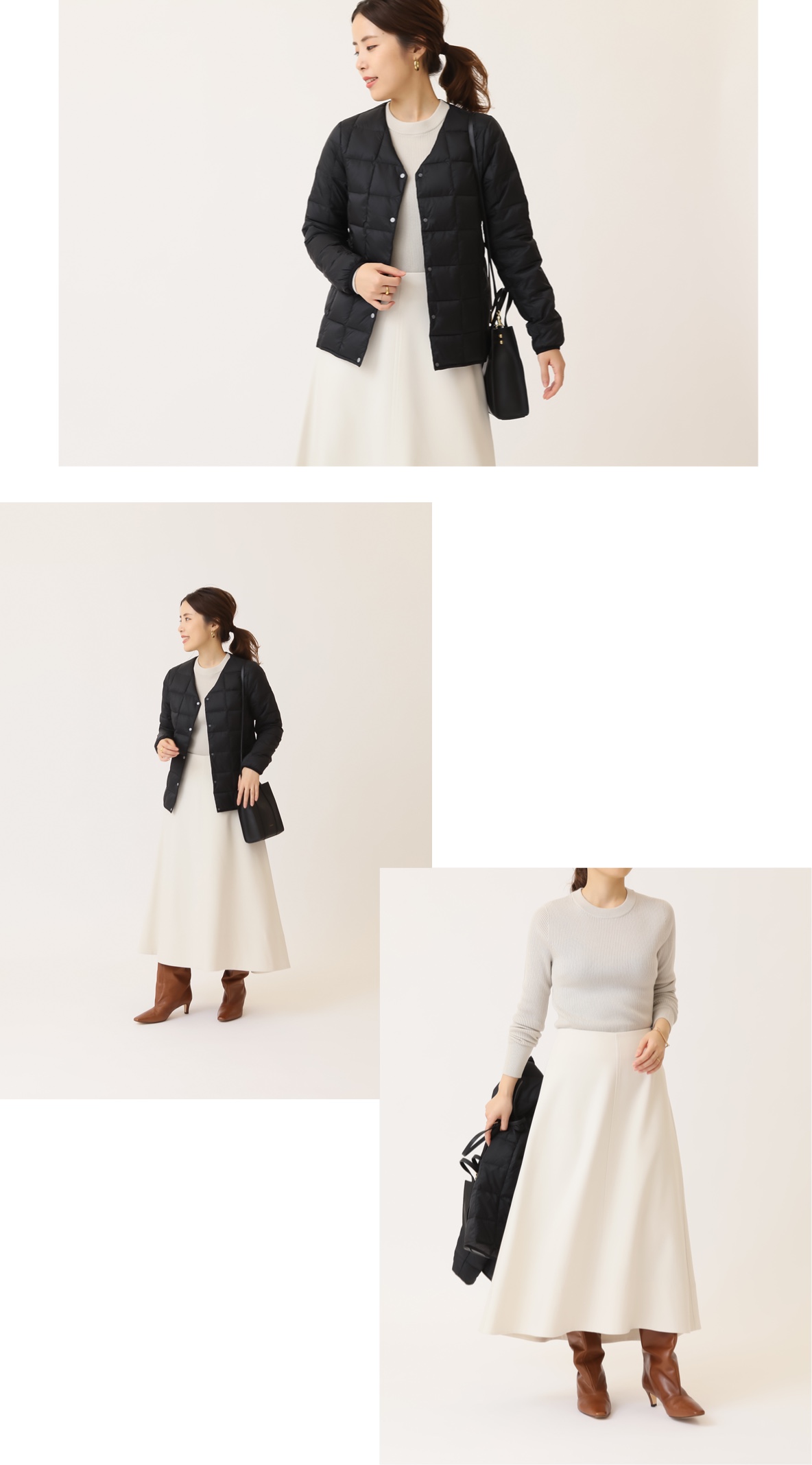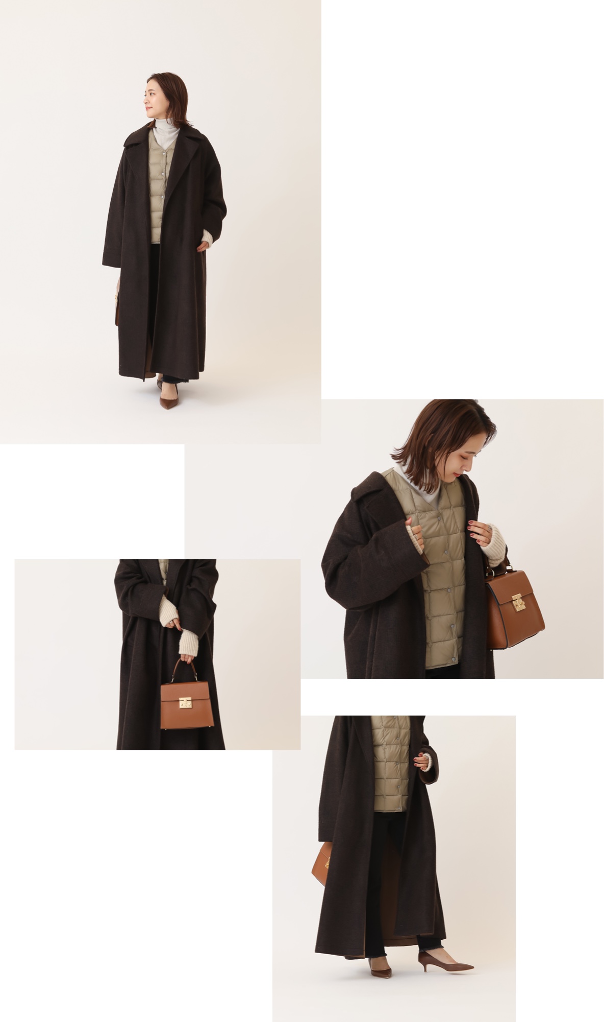 軽さとエレガントな揺れ感が魅力のローブコート。オーバーサイズならではのベストコンビなのがインナーダウン。着膨れすることなくインできて、スタイリッシュな印象をプラス。フィンガーレスグローブもニュアンスベージュで色味を統一。