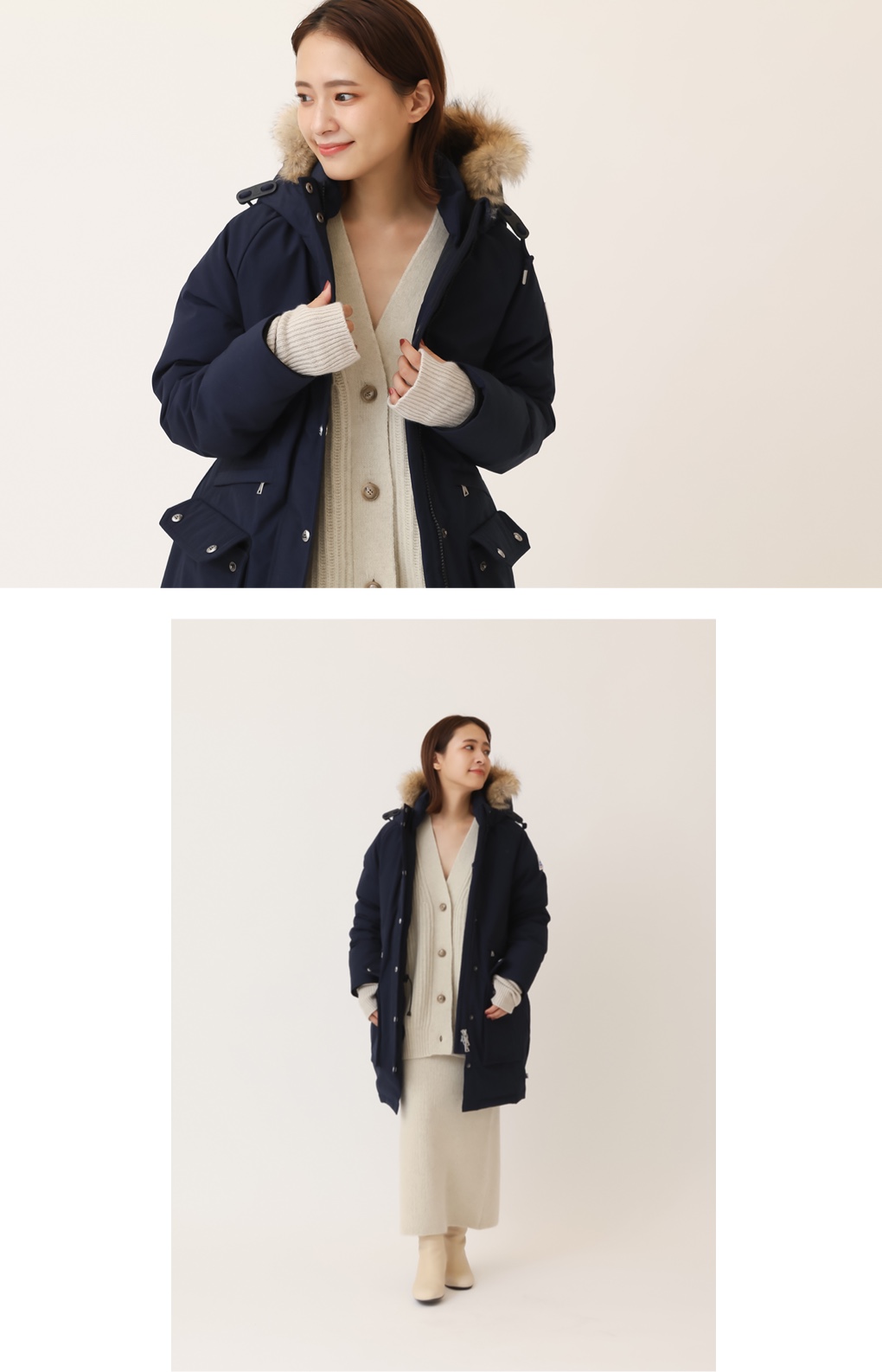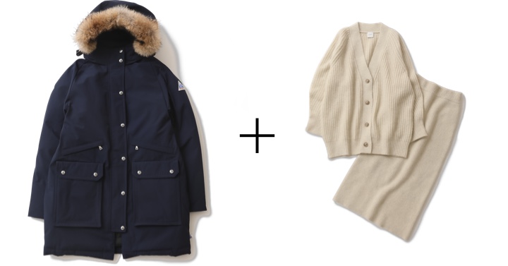 こちらは<Cape Heights>の定番マウンテンジャケット。耐水性と防風性に優れた生地を使用し、インナーはダウンのキルティングが。ヤクの糸をふっくら畦編みしたカーディガンとニットスカートのセットでフェミニンな洗練感をプラス。