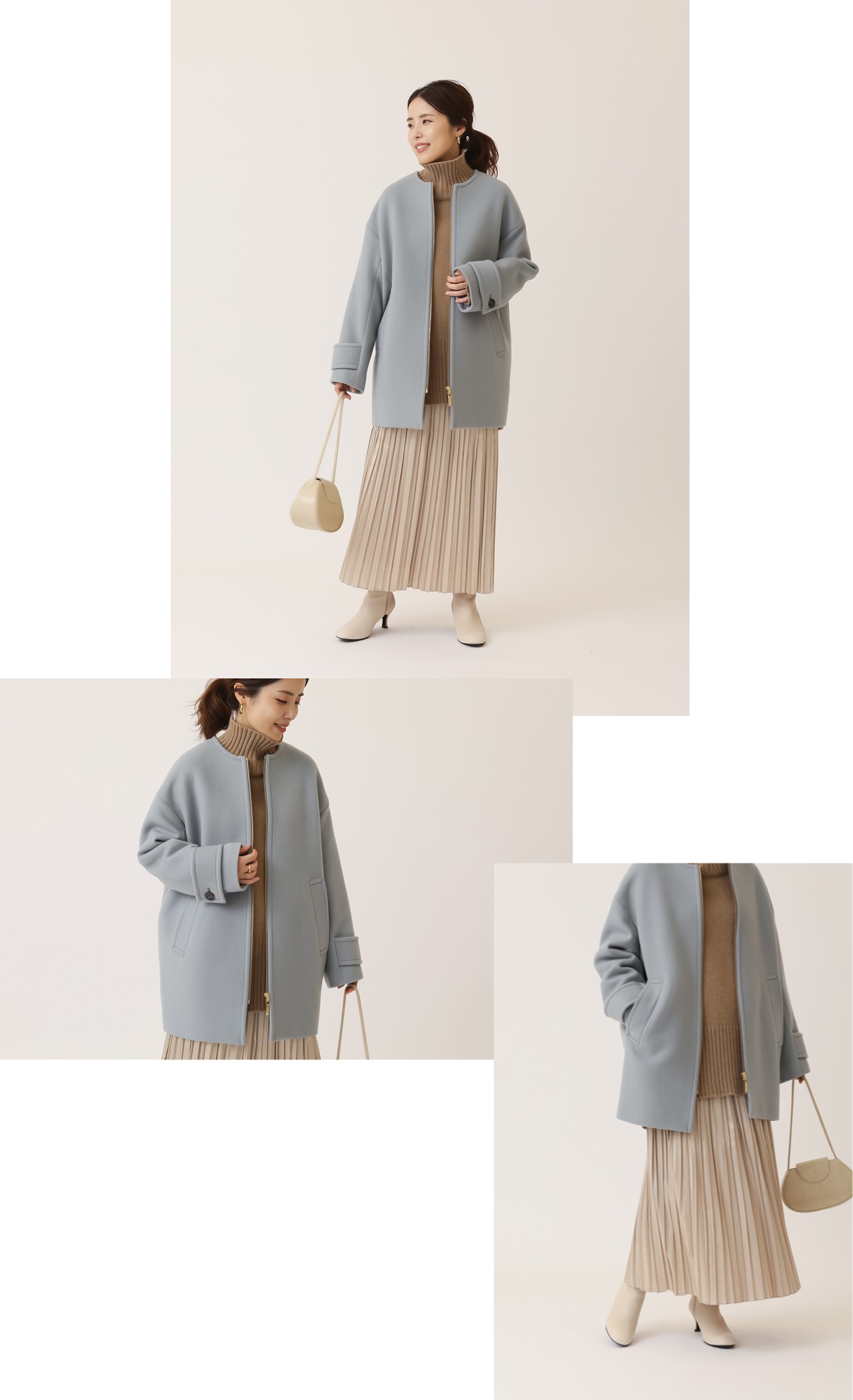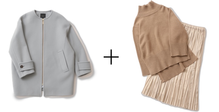 上質素材ゆえの畝と光沢が高級感たっぷりのノーカラーコートは、ダルブルーでぐっとモダンな雰囲気に格上げ。リュクスなアウターにぴったりなピュアカシミヤのタートルネックニットと、箔プリントのメタリックプリーツスカートで華やかに。
