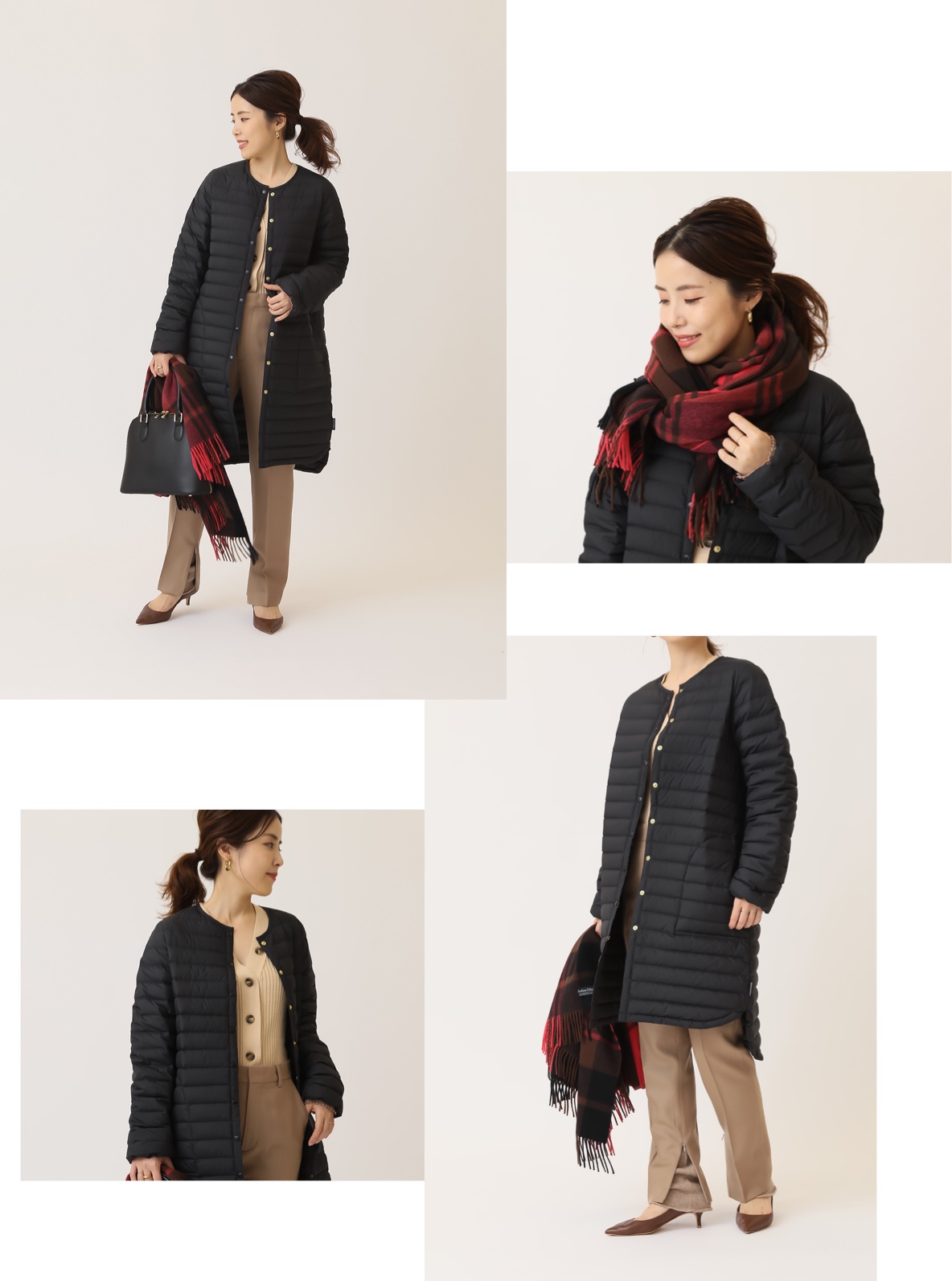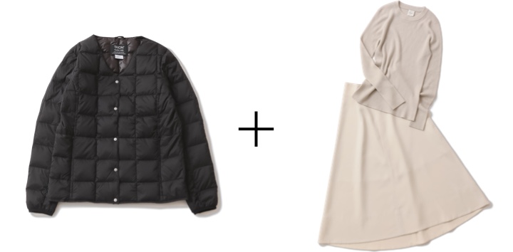 上のホワイトの色違いでブラックの<Traditional Weatherwear>ダウンは、インナーとしてだけでなく主役アウターにもなる優秀デザイン。コーデのポイントになる赤チェックのストールをMIXして、カジュアルすぎない大人のダウンコーデをメイク。