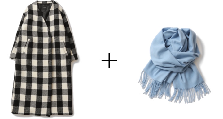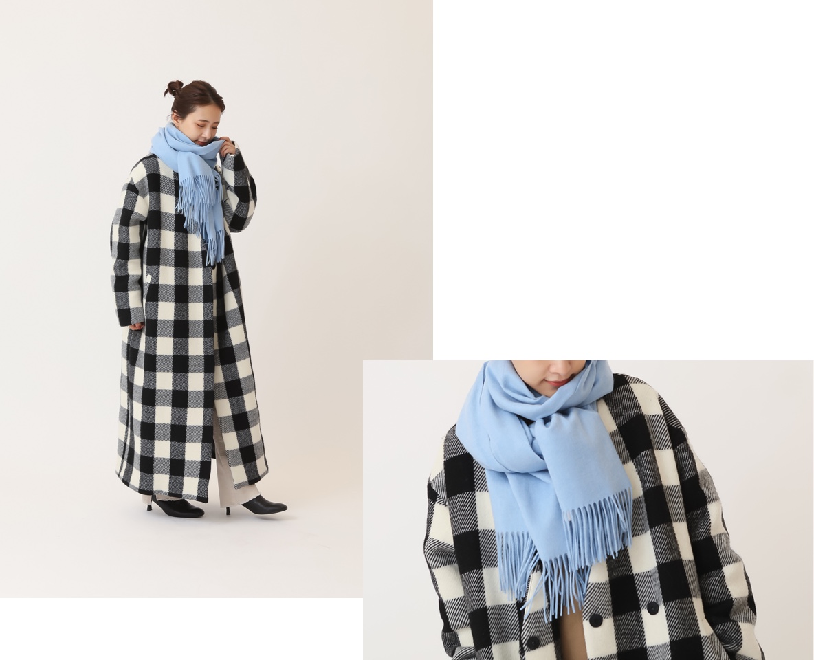 子どもっぽくならないキレイめなブロックチェックが魅力の着映えコート。目を引く柄を、ミニマルなVネックカラーのマキシシルエットで落とし込んだのもポイント。鮮やかなブルーのカシミヤストールを巻けば、視線を上に集めてスタイルアップ。