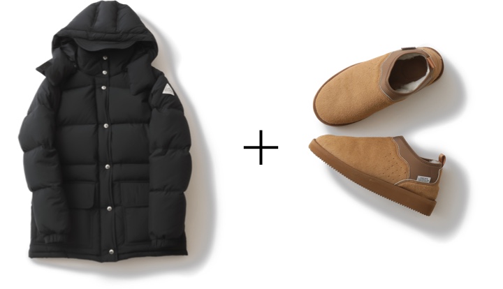 コンパクトなデザインで着膨れせずスタイリッシュに着られる<Cape Heights>のショートダウン。冬の定番アウターには、今年らしいムードにキマる旬小物を取り入れて。アッパーをハラコ素材で別注した<SUICOKE>スリッポンで抜け感をプラス。