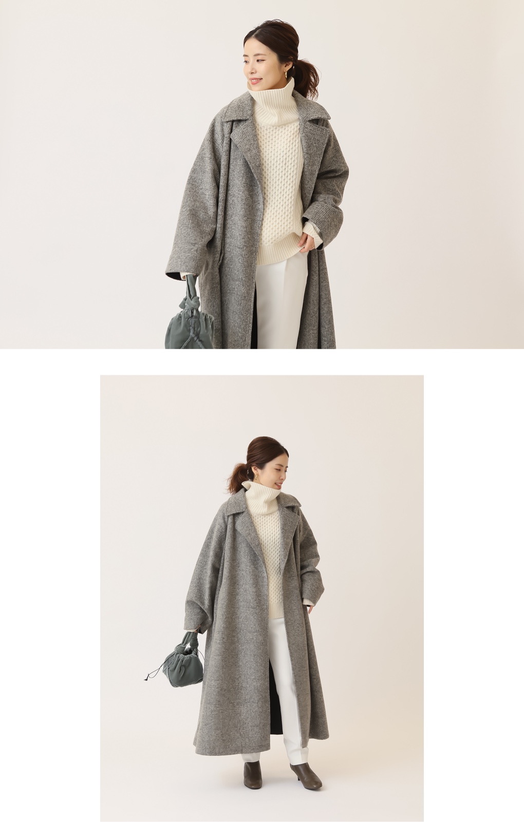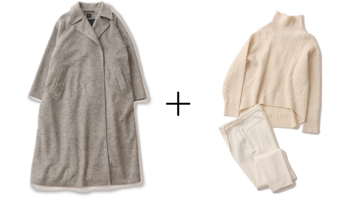 マニッシュにもエレガントにも振れる、便利な着流しオーバーコート。表情豊かなケーブル編みのタートルネックニットを重ねれば、ワントーンのワンツーコーデでも奥行きのあるキレイめなパンツスタイルに。