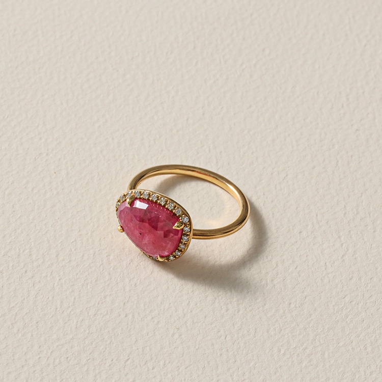 勝利を呼ぶパワーを持つルビー。そのまわりを、「永遠の絆」の意味をもつダイヤモンドが包んだデザイン。ダイヤモンドは、高い透明度と輝きの美しさから「純粋無垢」を表し、ストレスやネガティブな感情を浄化して、健やかな精神状態を保つ効果があるとされています。