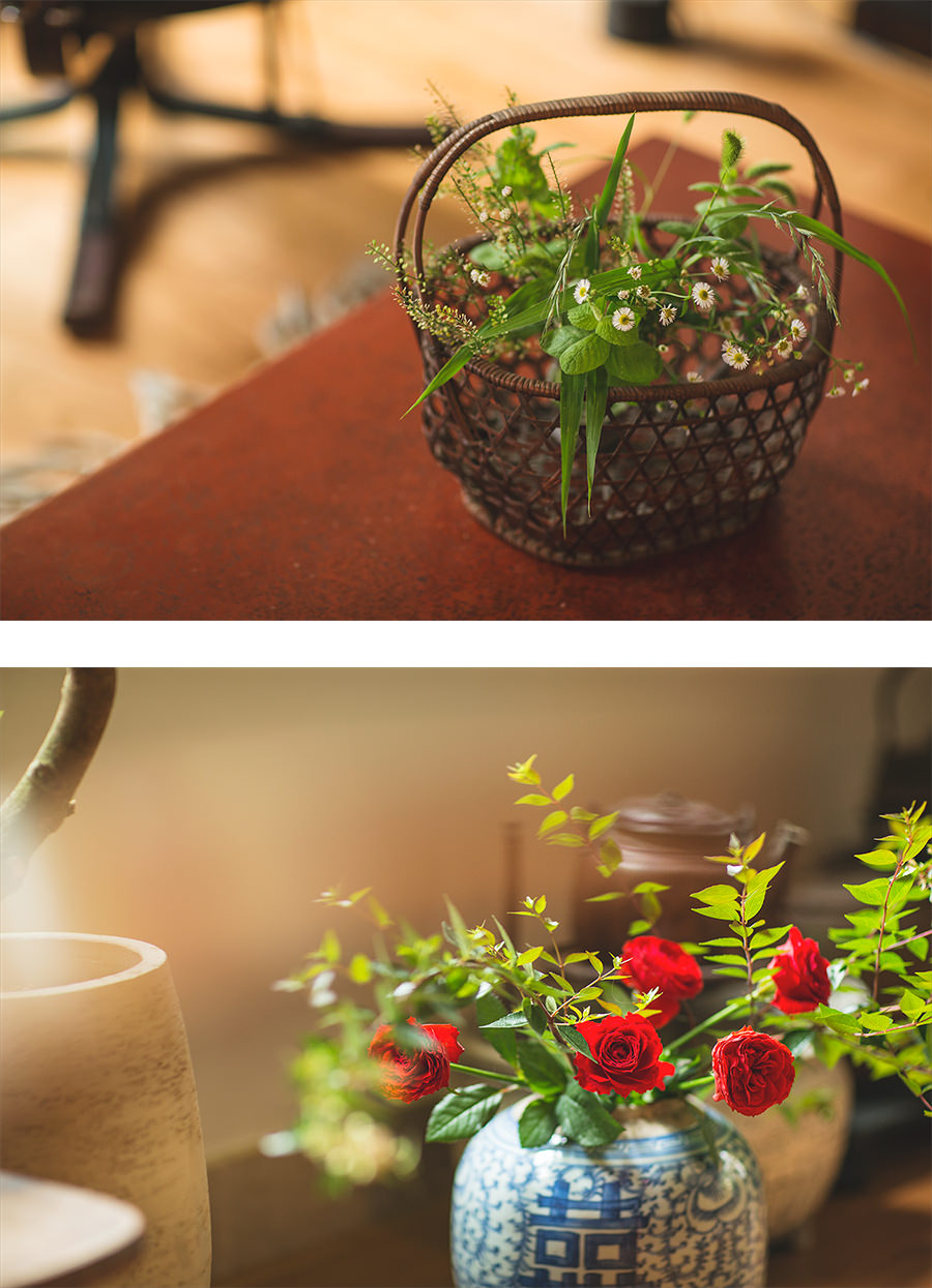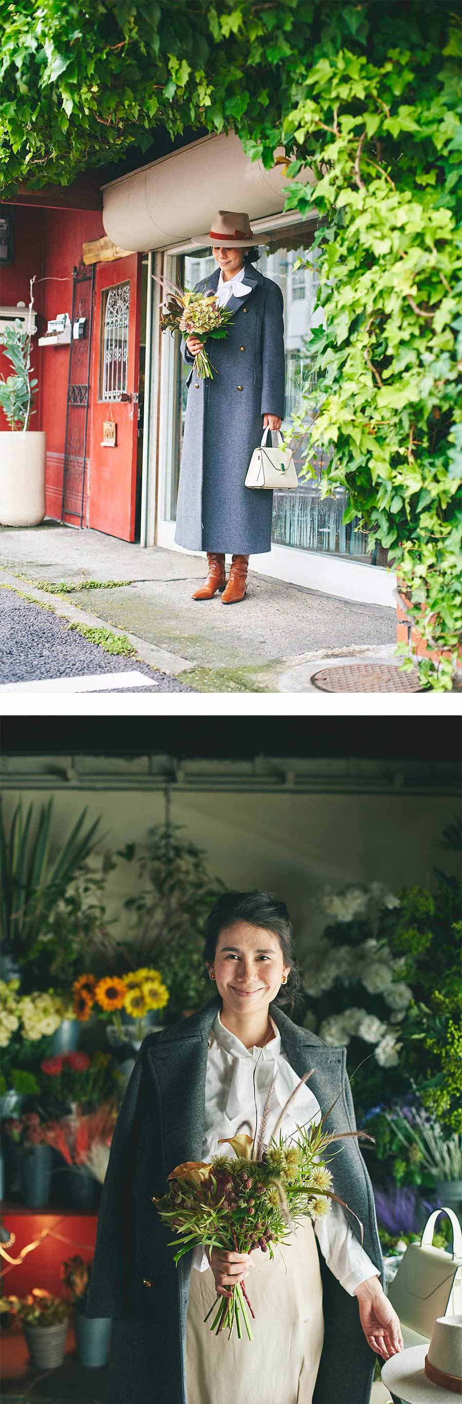 イメージはパリジェンヌ。自由におしゃれ楽しんで仕事帰りによく立ち寄る「花屋四季」。ブーケはもちろん、まるでパリにいるかのようなお店の雰囲気も素敵。この日は、グレーのマニッシュなロングコートに、ボウタイのシャツとシルクのスカートを。テイストも素材も自由にミックスするのがマイスタイル。