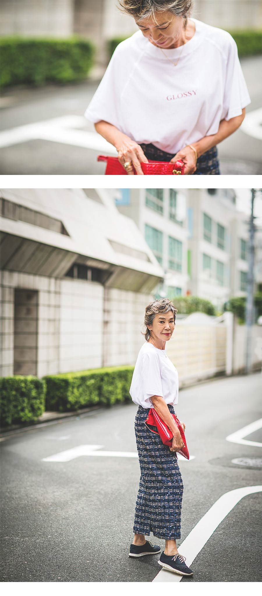 スカートの楽しみ方も気分次第私の場合、スカートはドレスアップのシーンでよく着るアイテム。でも、ときにはTシャツやスニーカーを合わせ、いつもと違う表情を楽しむことも。スニーカーはスカートの色と、バッグはTシャツのロゴの色とシンクロさせ、私なりのトリコロール配色を満喫。