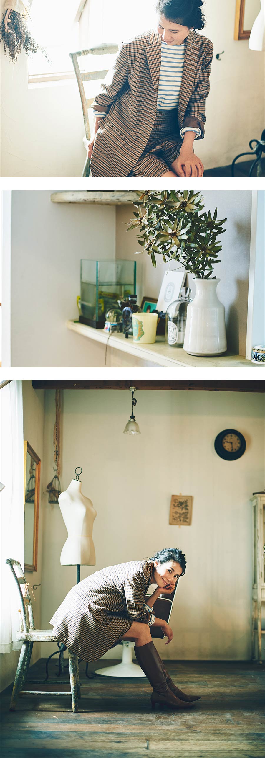 タータンチェックはとことんノーブルに私にとっては、初挑戦アイテムの、タータンチェックのジャケットとショートパンツのセットアップ。柔らかなブラウンをベースにしたノーブルな雰囲気を生かしたかったので、ロングブーツでブラウンをリフレイン。インナーはボーダーにして自分らしさを。