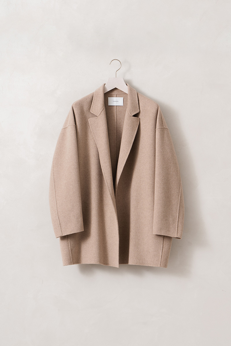 - カーディガンのように気軽に羽織れるリバーショートコート。毛並みの綺麗な高密度の二重織素材は滑らかで、軽く着心地も抜群。女性らしい丸みのある立体的なシルエットや打ち掛けボタンをつけるなど、細部までこだわりが満載。