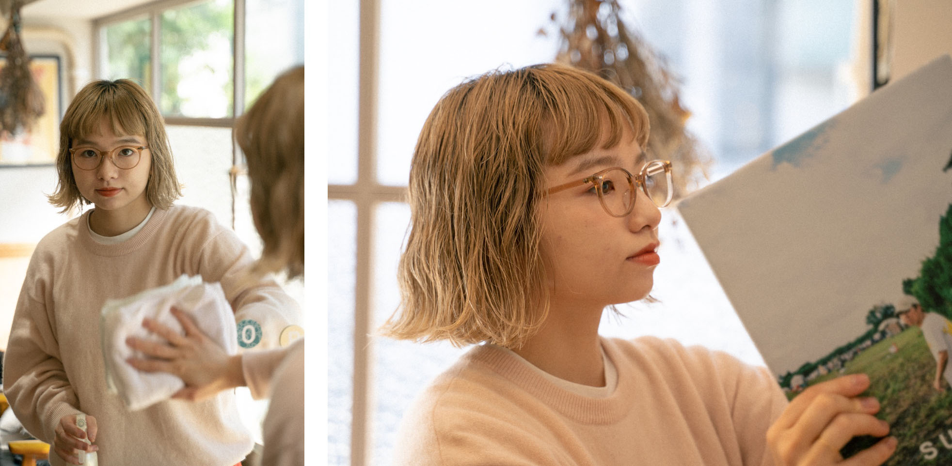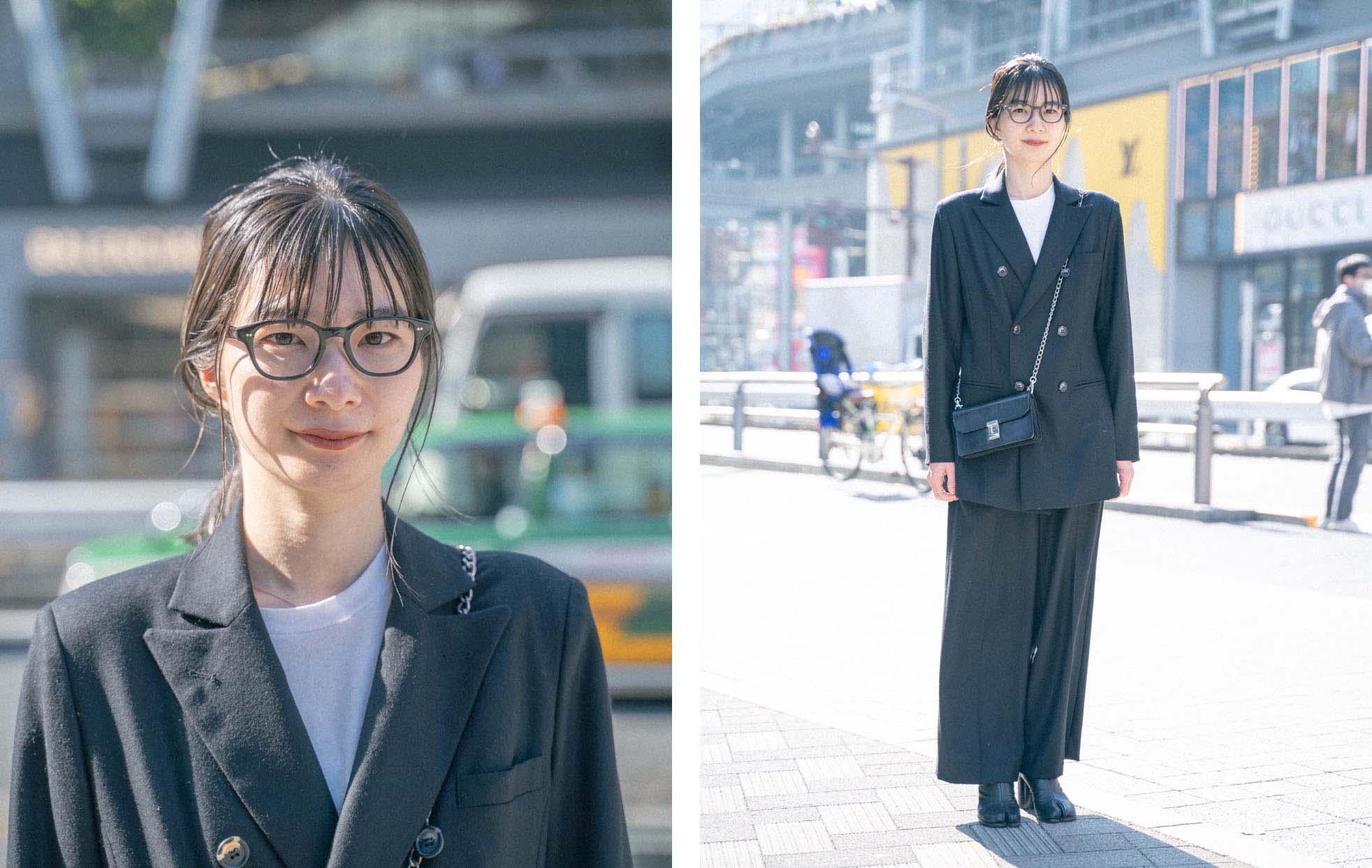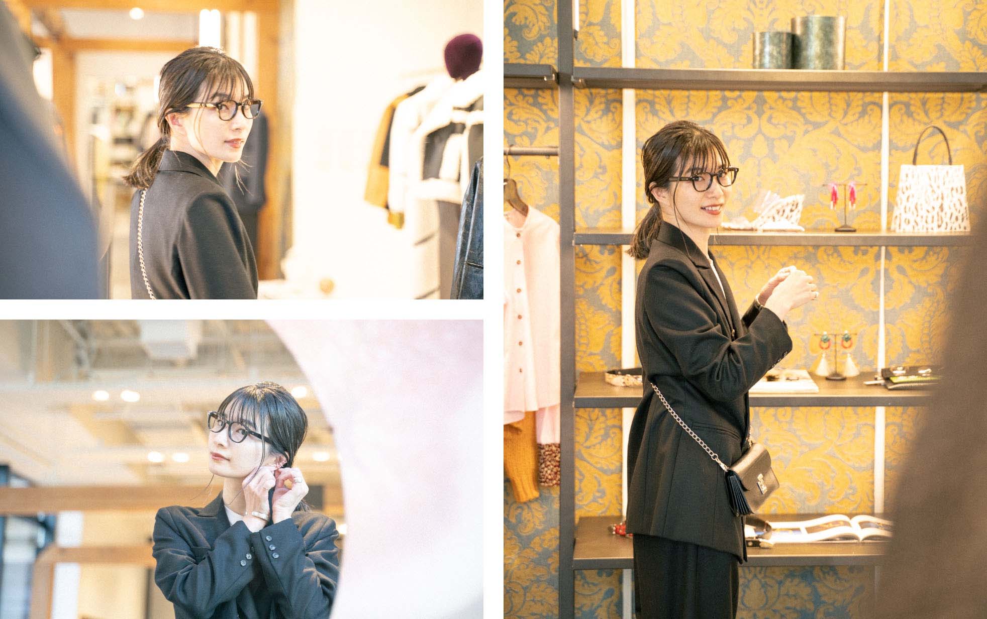 普段めがねを選ぶポイントは、普段洋服があまり明るい色というよりかは、黒だったり、茶色だったり、グレーだったりを選ぶことが多く、眼鏡も黒だったり、鼈甲柄だったり、渋めのものを手に取ることが多いです。かけて顔になじむかどうかが眼鏡を選ぶポイントかなと思います。今日眼鏡をかけてみて、元々クラシックな形が好きで、今回ちょっと太めの焦げ茶色のフレームで掛けやすくて、仕事でもプライベートでもいいなと思いました。