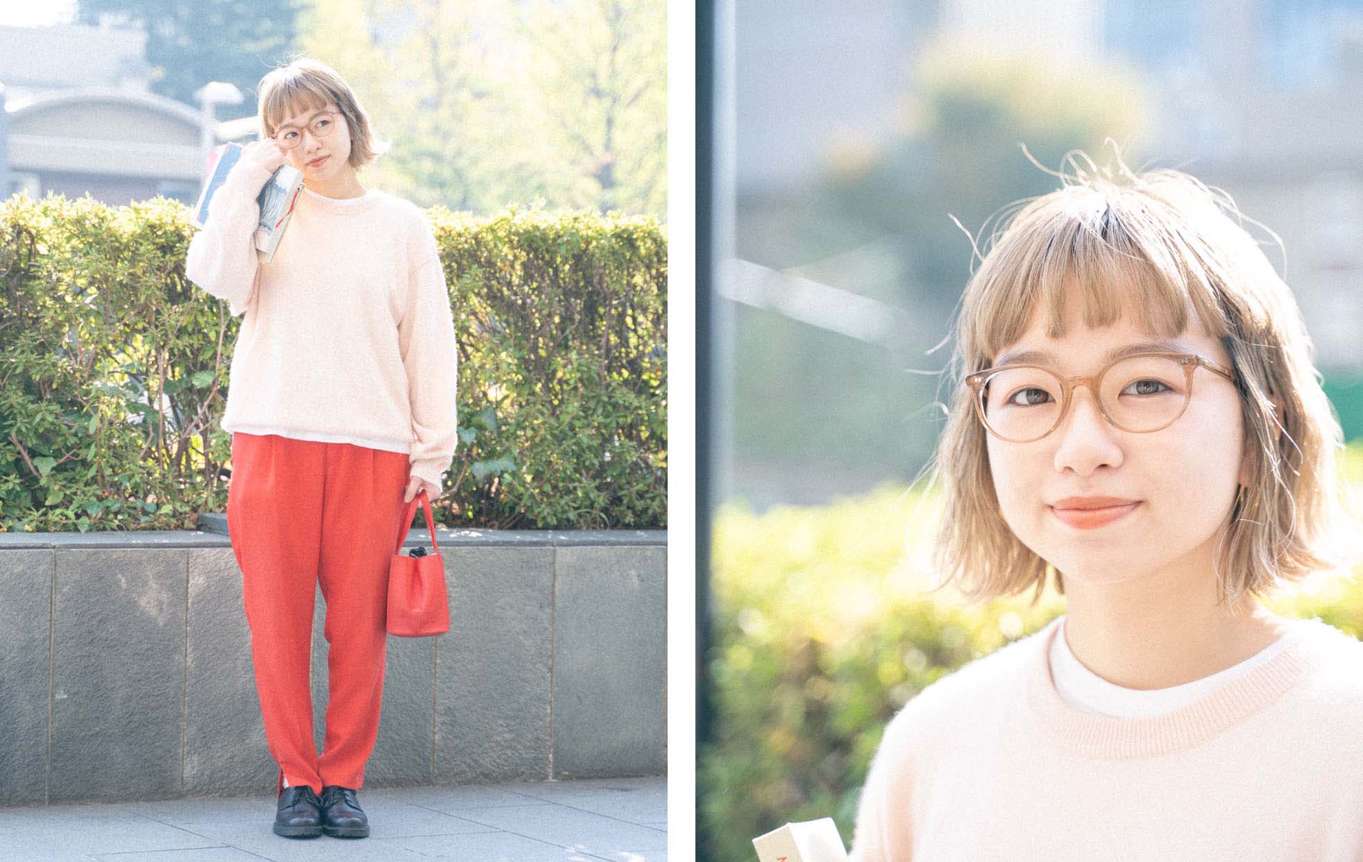 パンツは赤でウェアも明るめでかばんも赤の同系色なのでアクセサリーやめがねはシンプルだけど、存在感がありシンプル過ぎないものを選んでみました。