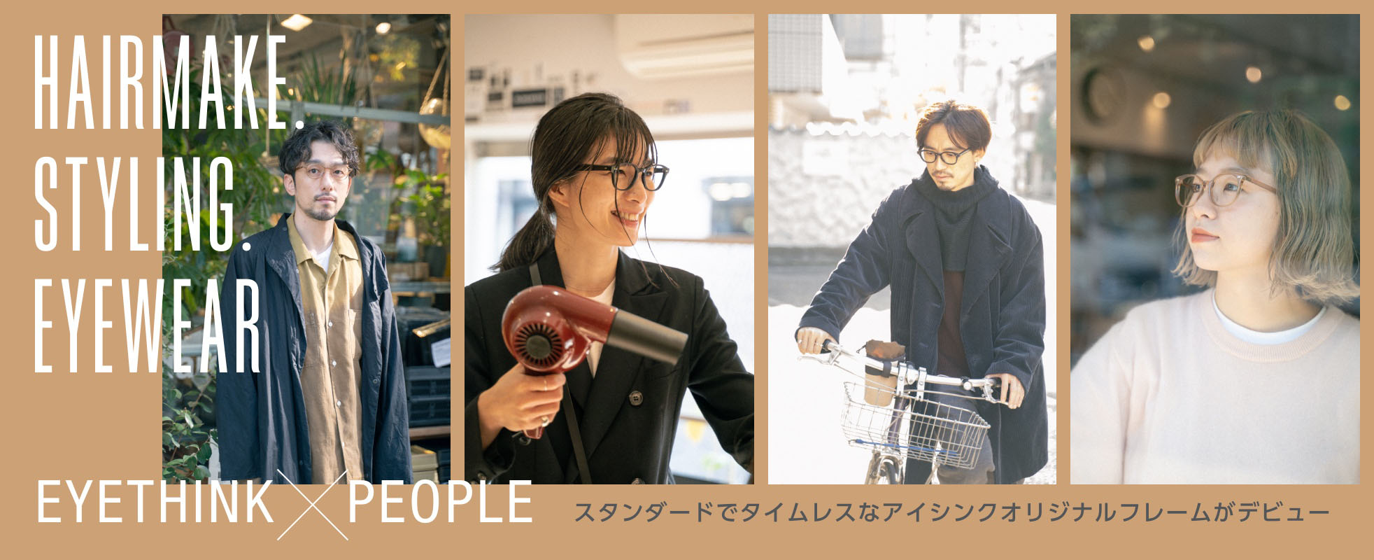 シーズンのキービジュアルや特集ページなどでいつもヘアメイクを担当してくれている 表参道にあるヘアサロンpeople(ピープル)の方々にアイシンク初のオリジナルフレームを掛けて頂きました。 「タイムレス」、「スタンダード」をキーワードに柔らかくリラックス感を与えてくれるアイウェアの普遍的なデザインをベースに制作したフレームは、国内のメガネ職人によるハンドメイド。