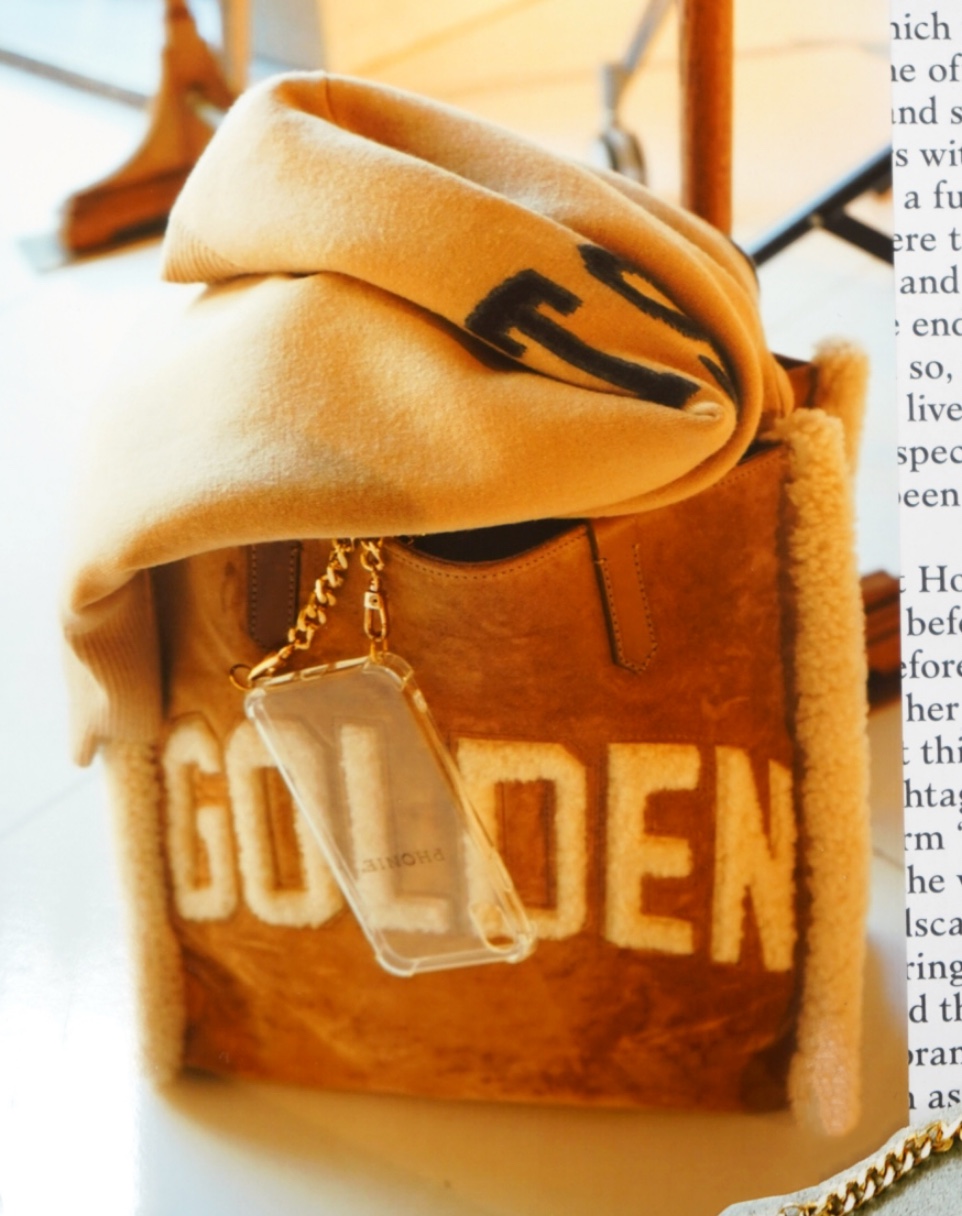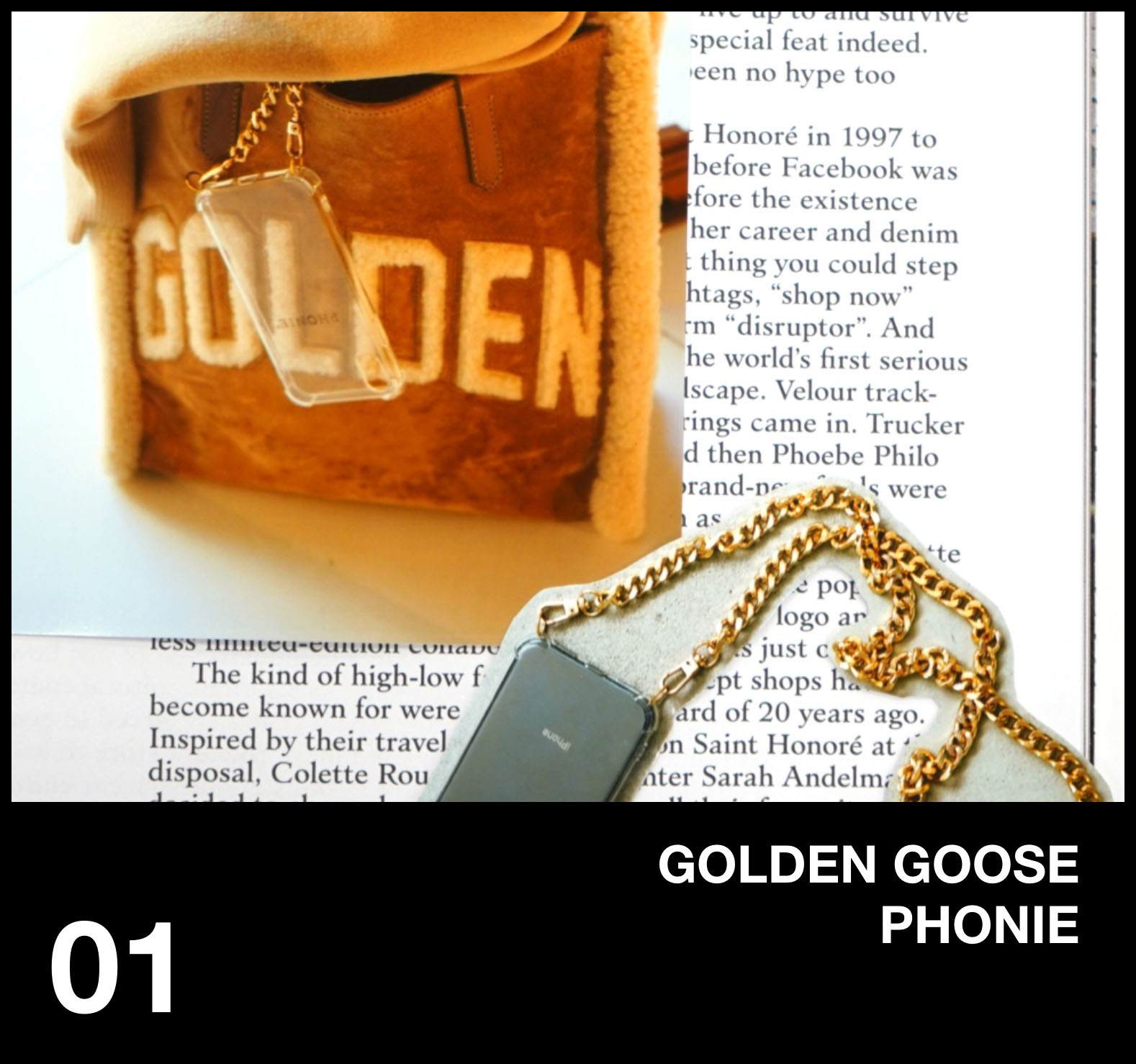 - 大容量なサイズ感に、主役級なインパクト。<GOLDEN GOOSE>ムートントートバッグがあれば、思い切り冬のコーディネートを楽しめそう。<PHONIE>のi-Phoneケースは、アクセサリー代わりにもなるエッジィなゴールドのきらりとしたチェーンがワンポイント。