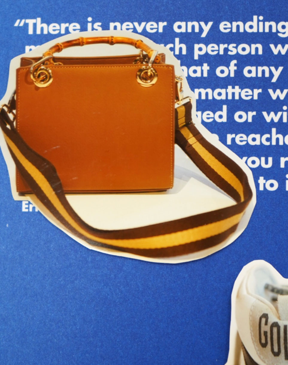 - バンブーハンドルのキレイめバッグは、ストライプベルトでちょっとトラッドなテイストもMIX。その日の気分で付け替えられるので、自分なりのカスタマイズでお気に入りのマイバッグに。<GOLDEN GOOSE>のミドルカットスニーカーで抜け感を添えて。