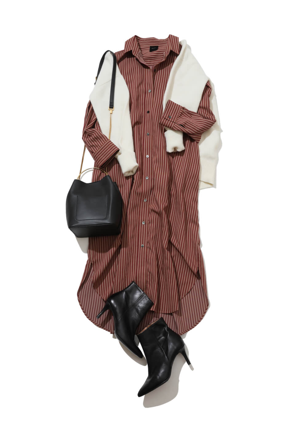 着こなしの幅が広く、晩夏から秋までロングシーズン活躍するストライプシャツワンピが主役。ゆったりとしたロングシルエットが華奢見え効果を発揮し、ストライプ柄が縦長ラインを強調してスタイルアップにも◎。白ニットをラフに肩掛けすれば、秋のニュアンス漂うコーデが完成。