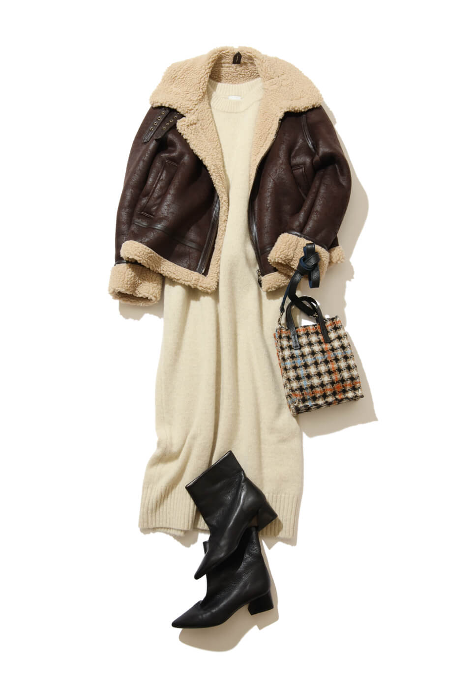 希少価値の高い白ヤクの毛を使った、ニュアンシーなホワイトニットワンピースが主役。体のラインを拾わない絶妙なシルエットと優しい着心地がオフの装いにぴったり。合わせたのはアビエイターブルゾンと黒ブーツ。ハードなアウターを合わせることで、ボンヤリした印象を回避してメリハリを。