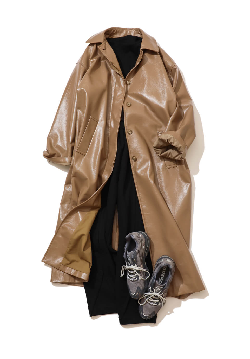リラックスな雰囲気と構築的なシルエットが融合した、モダンなスウェットセットアップでオフの日を満喫。ヴィンテージライクな加工も、こなれたムードを後押し。メンズライクなビッグシルエットコートをバサッと羽織って、一気にモードな装いに。パテントのようなツヤのあるフェイクレザーで、まわりと差をつけて。